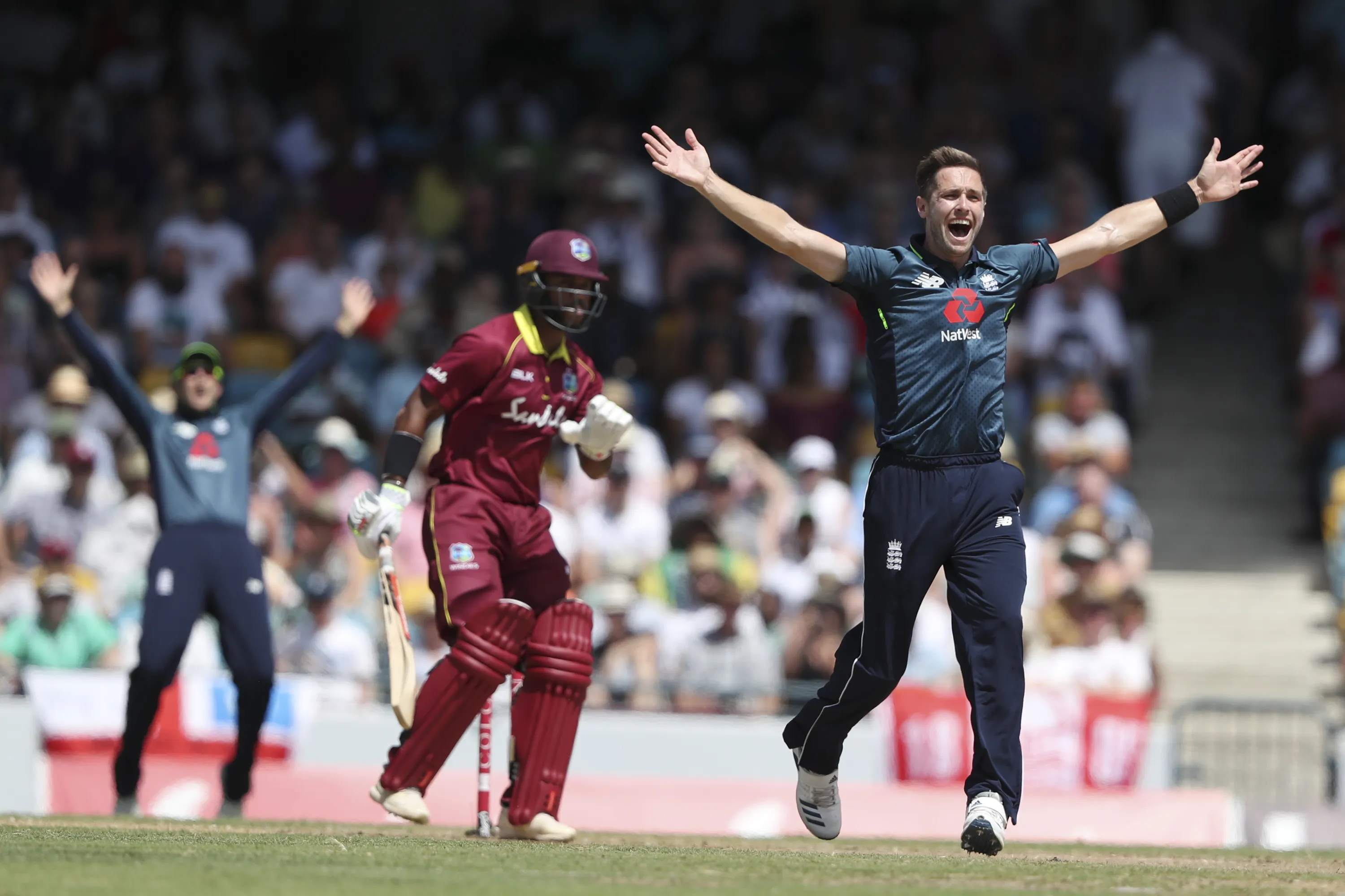 England's Chris Woakes unsuccessfully appeals for the wicket of West Indies' John Campbell during their first One Day International cricket match at the Kensington Oval in Bridgetown, Barbados, Wednesday, February 20, 2019. (Photo by Ricardo Mazalan/AP Photo)