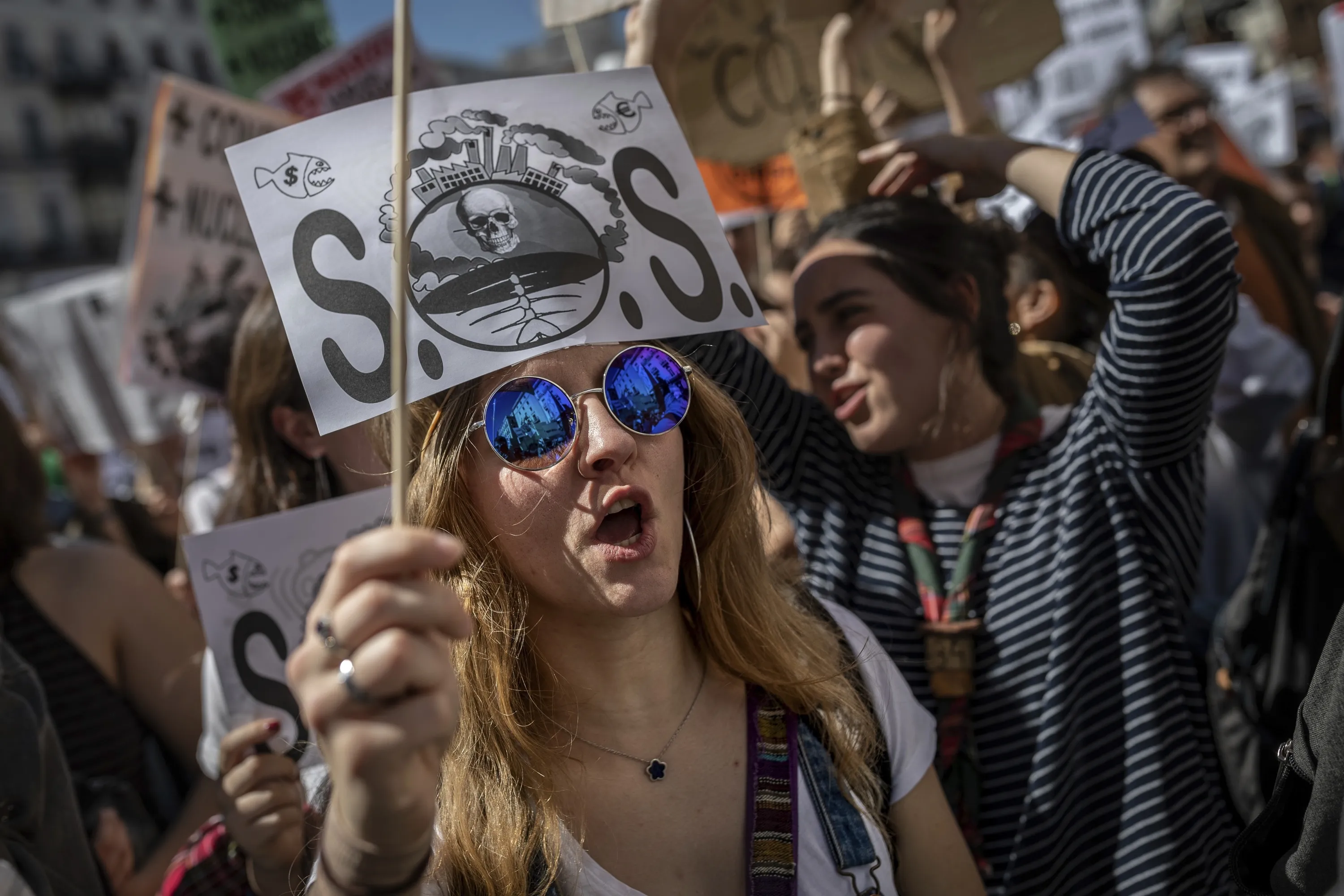 Students shout pro-environment slogans during a rally in Madrid, Spain, Friday March 15, 2019. Students mobilized by word of mouth and social media skipped class Friday to protest what they believe are their governments' failure to take tough action against global warming. (Photo by Bernat Armangue/AP Photo)