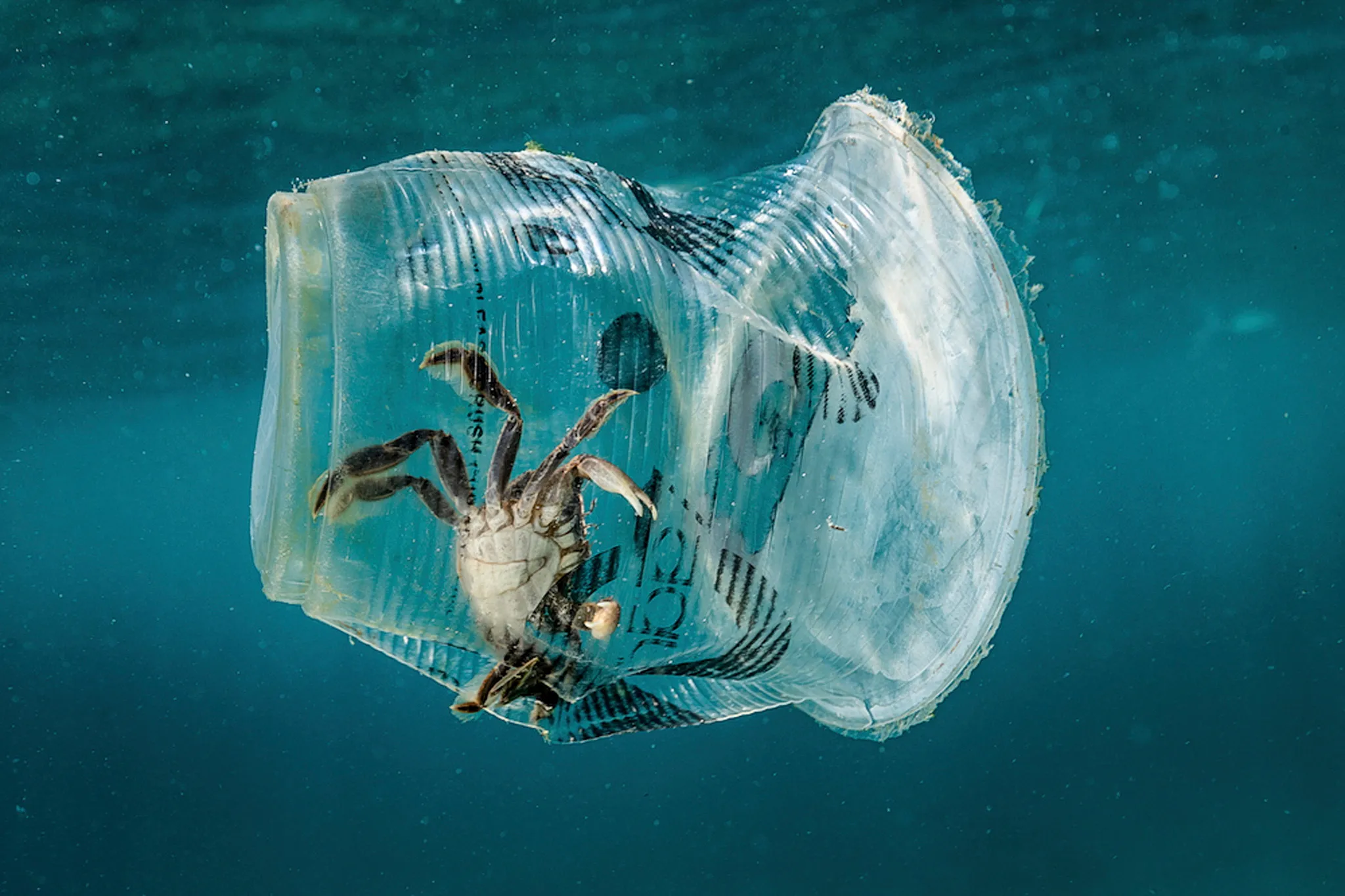 A handout photo made available by Greenpeace shows a crab stuck in plastic in Verde Island Passage, Batangas City, Philippines, 07 March 2019 (issued 12 March 2019). According to a data from the Global Alliance for Incinerator Alternatives (GAIA), Filipinos dispose 163 million pieces of single-use plastic sachets daily. An underwater exploration conducted by Greenpeace in Batangas, Philippines, single-use plastic sachets were found between, beneath, and on the corals and seabed of Verde Island Passage, the epicenter of marine biodiversity in the world. (Photo by Noel Guevara/EPA/EFE/Greenpeace)