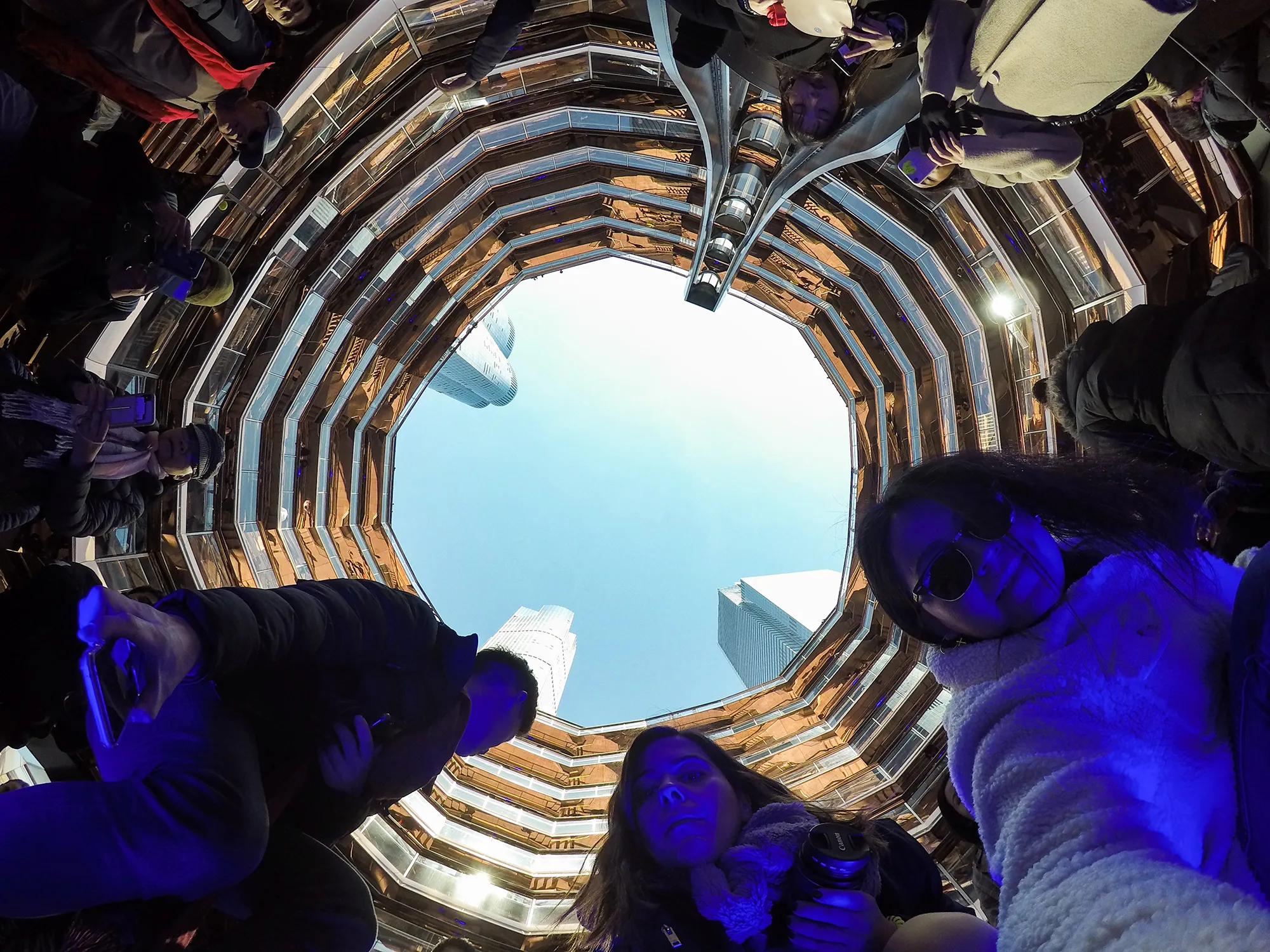 Visitors try to get the best picture with their phones and cameras at the center of “The Vessel” a public art structure on the West Side of Midtown Manhattan in New York, United States on March 20, 2019. The elaborate honeycomb-like structure Vessel designed by the British designer Thomas Heatherwick, its consisting of 154 flights of stairs at Hudson Yards 2,500 steps, and 80 landings that visitors would be able to climb. Phase one of the Hudson Yards real-estate development project, which cost about 25 billion US dollars, opened on Friday. (Photo by Atilgan Ozdil/Anadolu Agency/Getty Images)