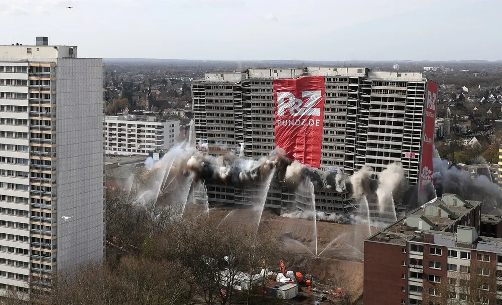 The “Weisse Riese” (White Giant) tower crumbles under the impact of explosives in a demolition in Duisburg, Germany, 24 March 2019. The demolition company uses 290 kilograms of explosives for the blasting to demolish the 45,000-ton and 22-storey residential building from the 1970s. The tower block is one of six buildings in the residential park in Duisburg's Hochheide district. The blasting of the building was planned for autumn 2017, but had to be postponed at short notice due to asbestos findings. (Photo by Friedemann Vogel/EPA/EFE)