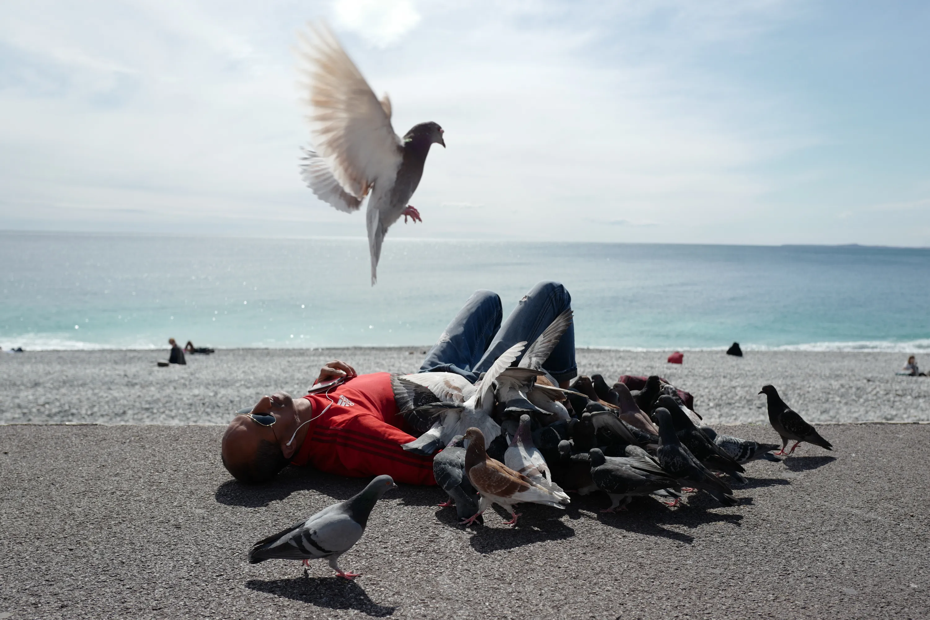 A man is lying with pigeons on the “Promenade des anglais” on the French riviera's city of Nice, on March 26, 2019. (Photo by Valery Hache/AFP Photo)