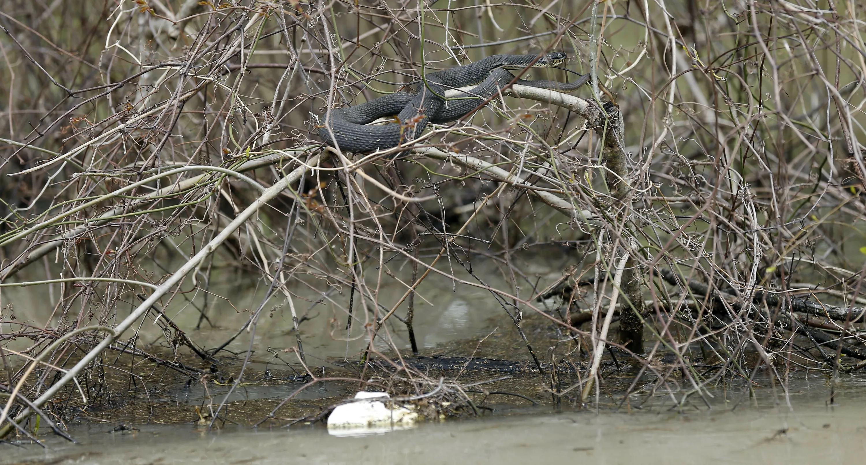 Even this water moccasin snake has taken to the upper branches of this bush to ride out the backwater flooding in Mississippi Delta farmland in Issaquena County, Miss., Friday, April 5, 2019. Residents and farmers are calling for a flood control and drainage project as part of a long-term plan to help the people in the rural flatlands where backwater flood waters have been standing for weeks. (Photo by Rogelio V. Solis/AP Photo)