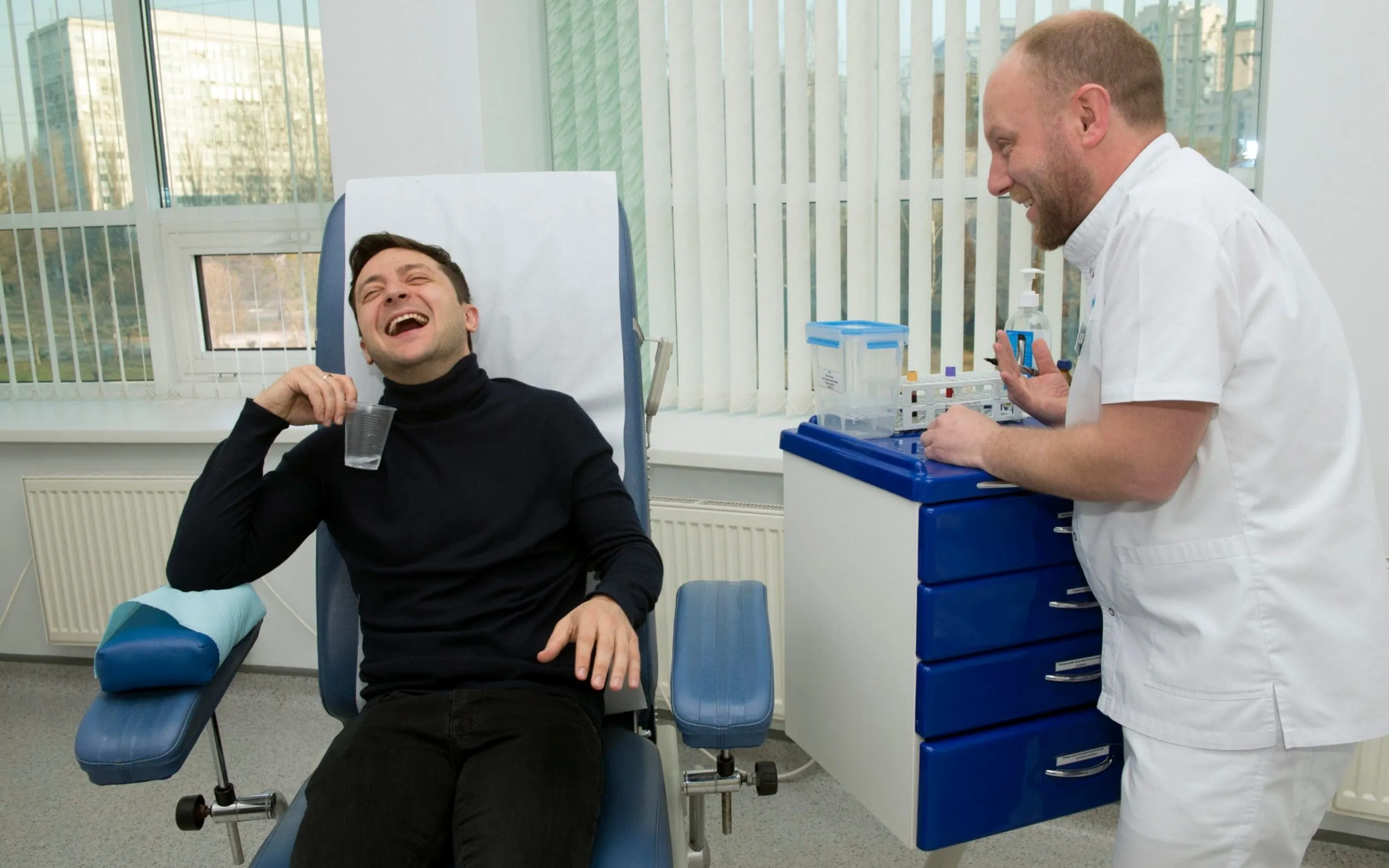 Volodymyr Zelenskiy, a popular comedian who left Ukraine's President Petro Poroshenko far behind in Sunday's presidential elections first round, laughs as he takes a blood test in Kiev, Ukraine, Friday, April 5, 2019. Ukraine's presidential candidates have taken alcohol and drug tests before a runoff vote on April 21. (Photo by Soya Shu/AP Photo)
