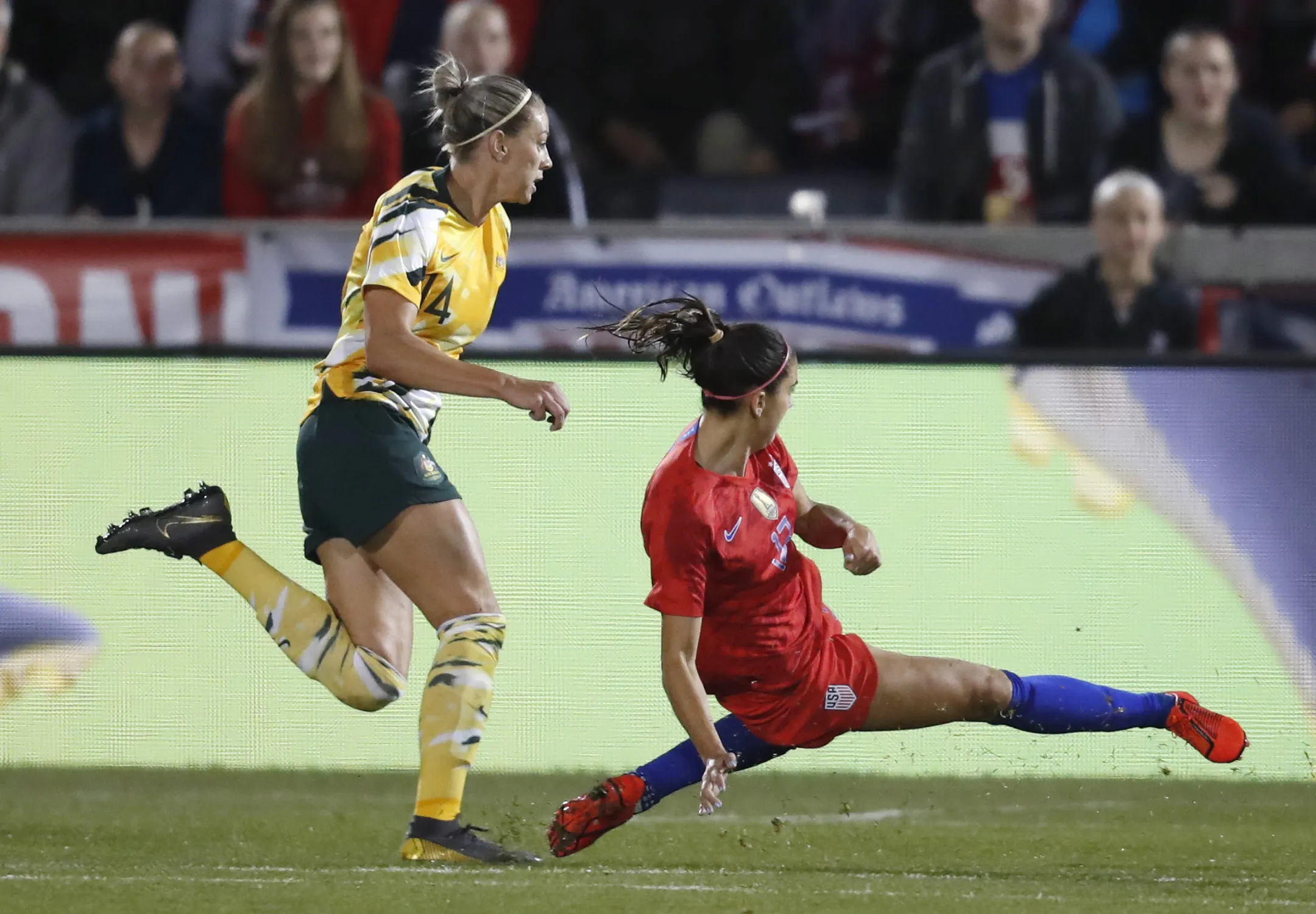 United States forward Alex Morgan, right, falls while scoring a goal as Australia defender Alanna Kennedy looks on during the first half of a friendly soccer match Thursday, April 4, 2019, in Commerce City, Colo. (Photo by David Zalubowski/AP Photo)