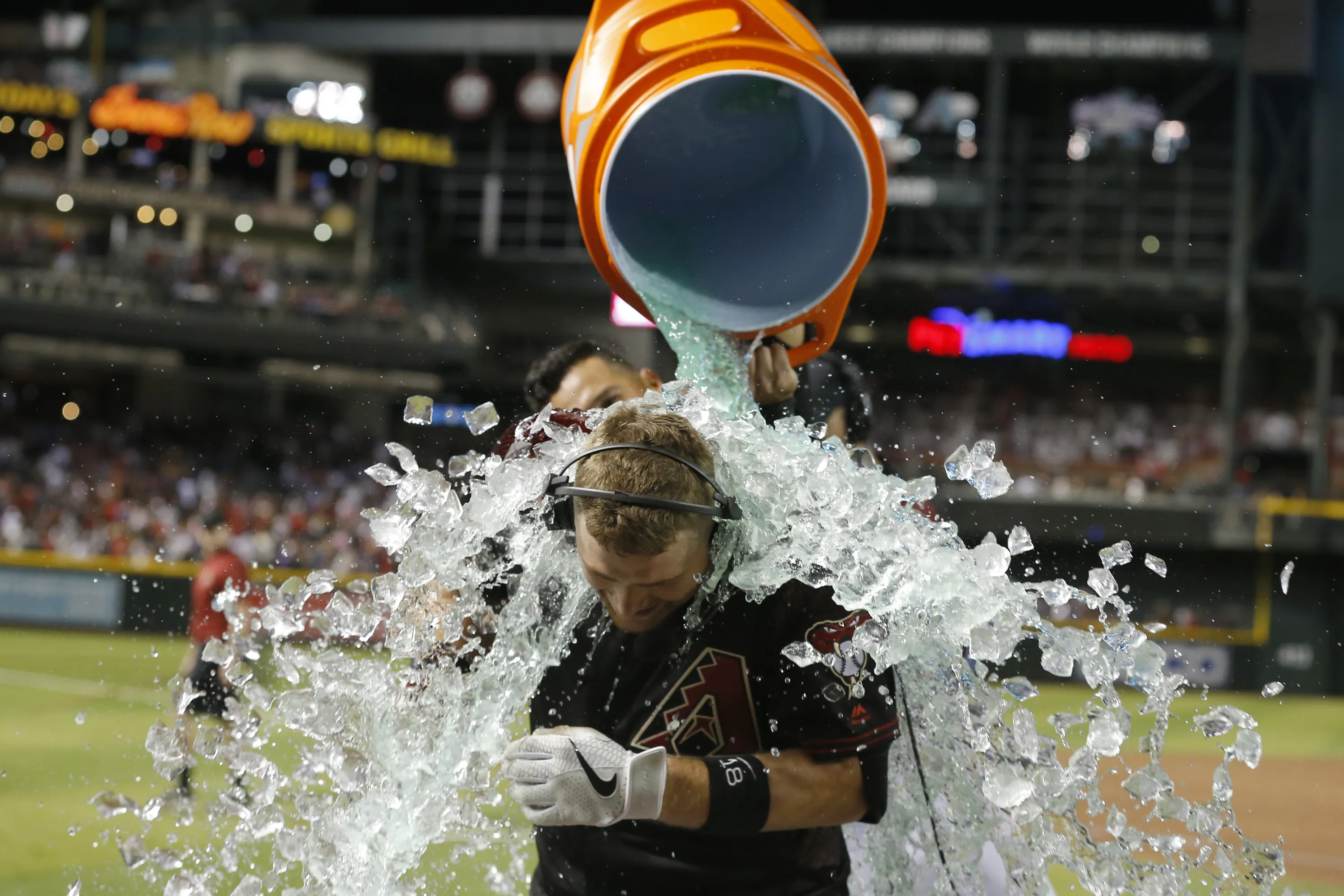 Arizona Diamondbacks' Carson Kelly is doused after hitting a walkoff single to defeat the Boston Red Sox in a baseball game, Saturday, April 6, 2019, in Phoenix. (Photo by Rick Scuteri/AP Photo)