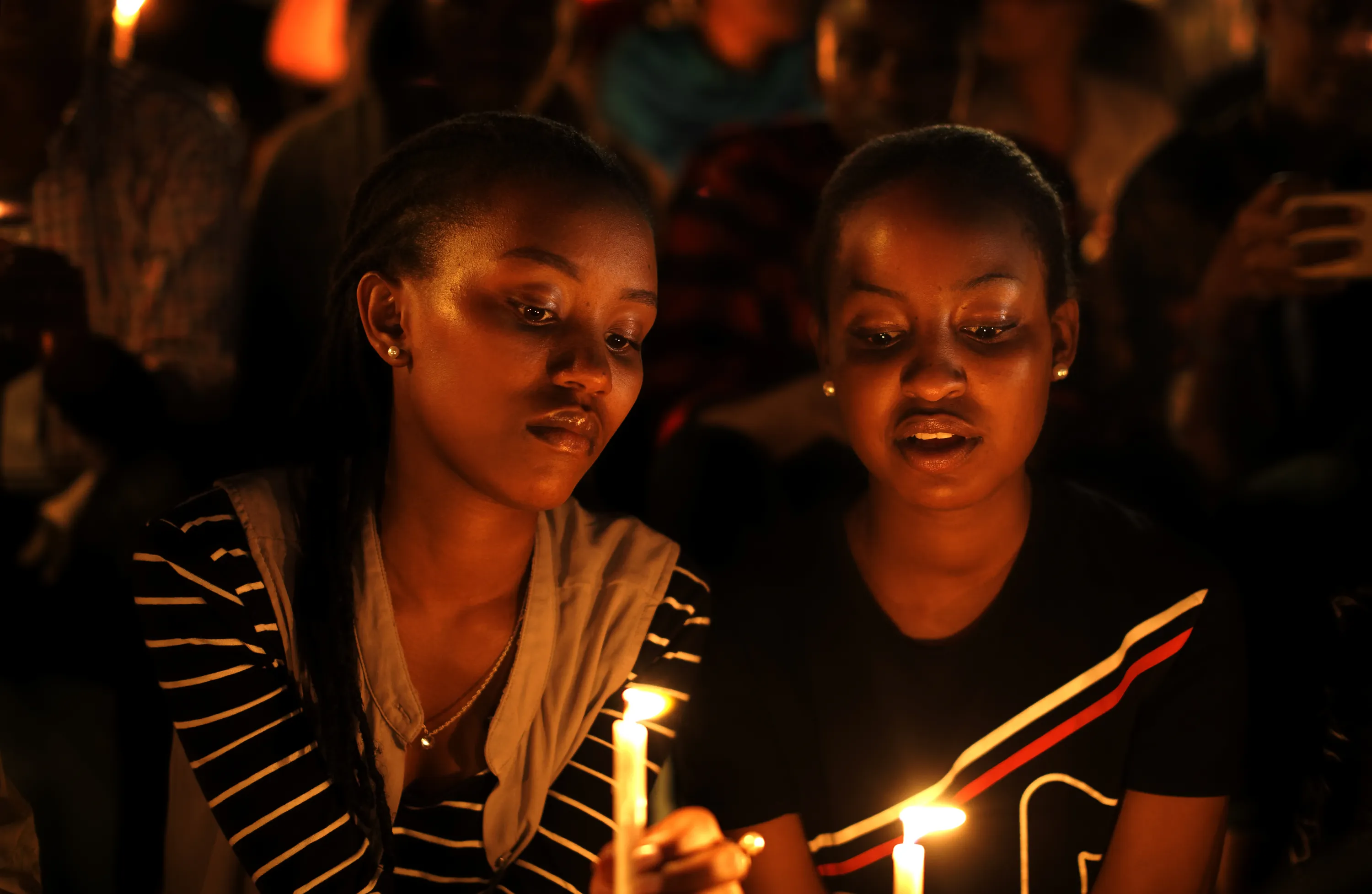 Rwandan women sitting in the stands, hold candles as part of a candlelit vigil during the memorial service held at Amahoro stadium in the capital Kigali, Rwanda, Sunday, April 7, 2019. Rwanda is commemorating the 25th anniversary of when the country descended into an orgy of violence in which some 800,000 Tutsis and moderate Hutus were massacred by the majority Hutu population over a 100-day period in what was the worst genocide in recent history. (Photo by Ben Curtis/AP Photo)