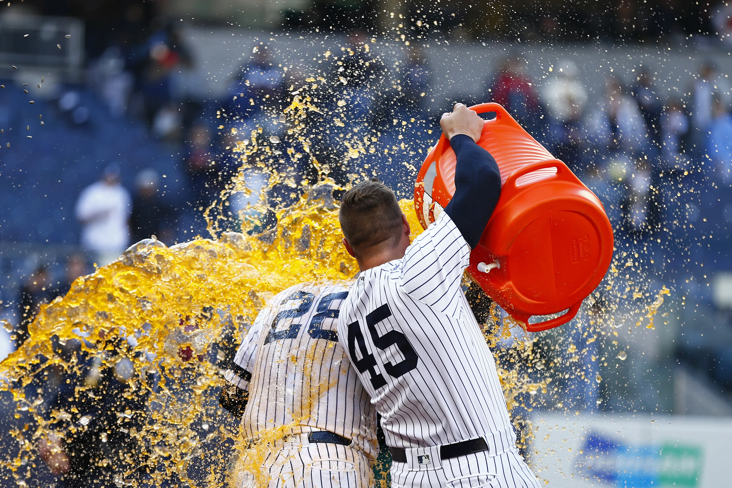 New York Yankees' Luke Voit (45) pours Gatorade onto Yankees' Austin Romine (28) after Romine hit a walk off single during the tenth inning of a baseball game against the Kansas City Royals on Sunday, April 21, 2019, in New York. (Photo by Adam Hunger/AP Photo)