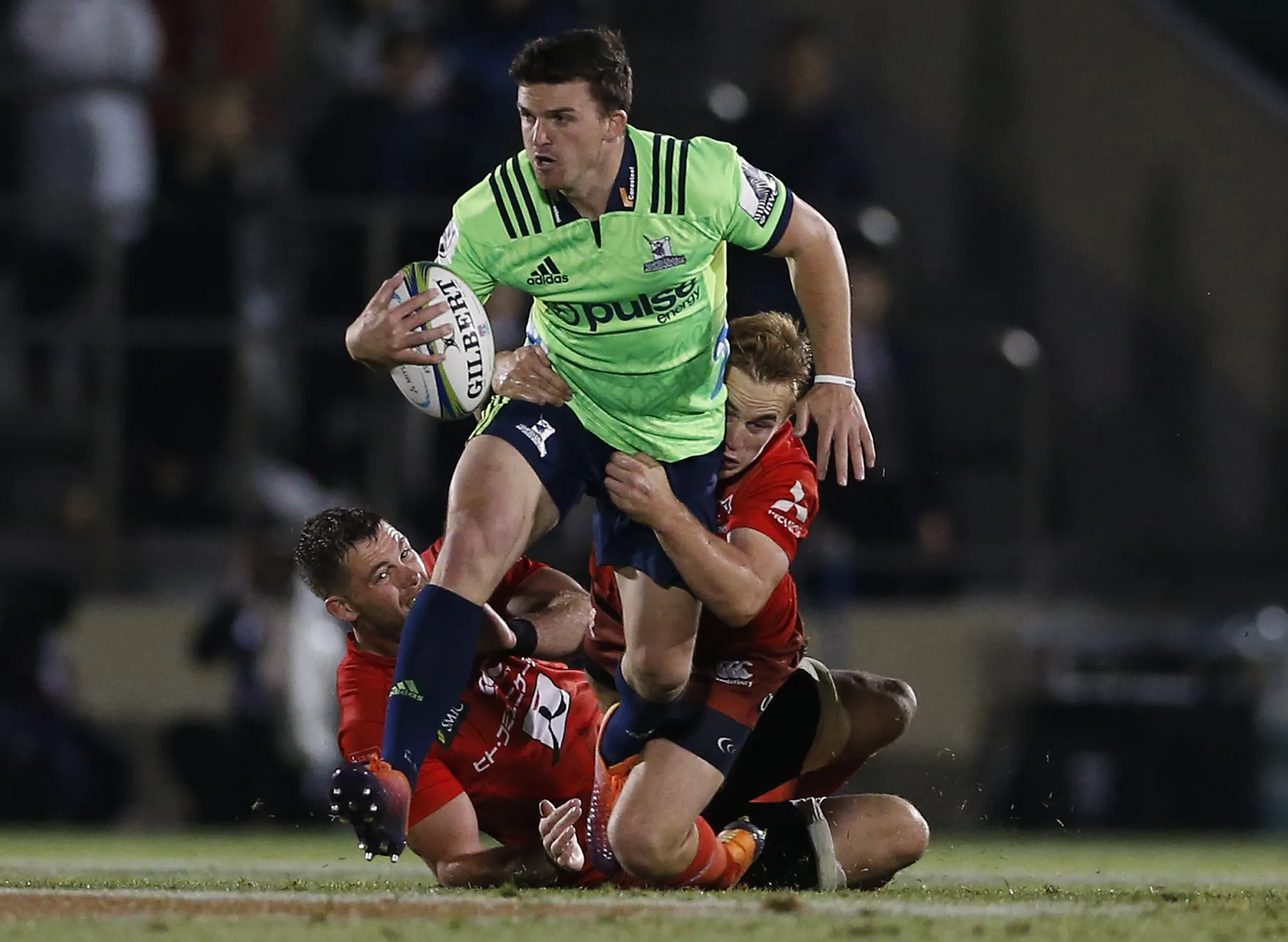 Highlanders' Bryn Gatland is tackled by Sunwolves' Hayden Parker, right, during the Super Rugby game between the Highlanders and Sunwolves in Tokyo, Friday, April 26, 2019. (Photo by Shuji Kajiyama/AP Photo)