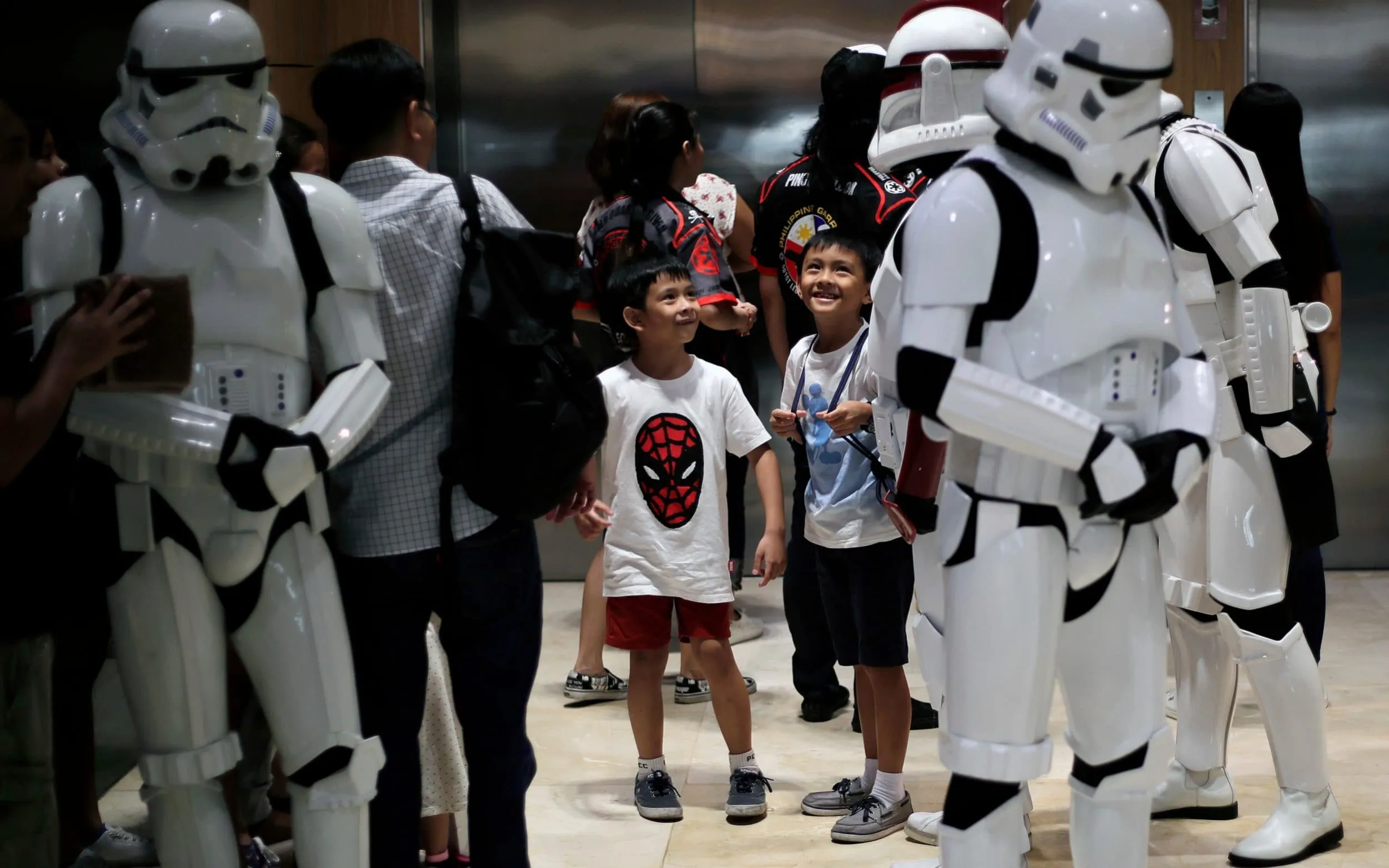 Two boys smiles as Filipino fans wearing Stormtroopers costumes attend a Star Wars Day celebration inside a shopping mall in Taguig city, south of Manil, Philippines, 04 May 2019. Star Wars Day is celebrated every 04 May by many fans in different parts of the world. (Photo by Francis R. Malasig/EPA/EFE/Rex Features/Shutterstock)