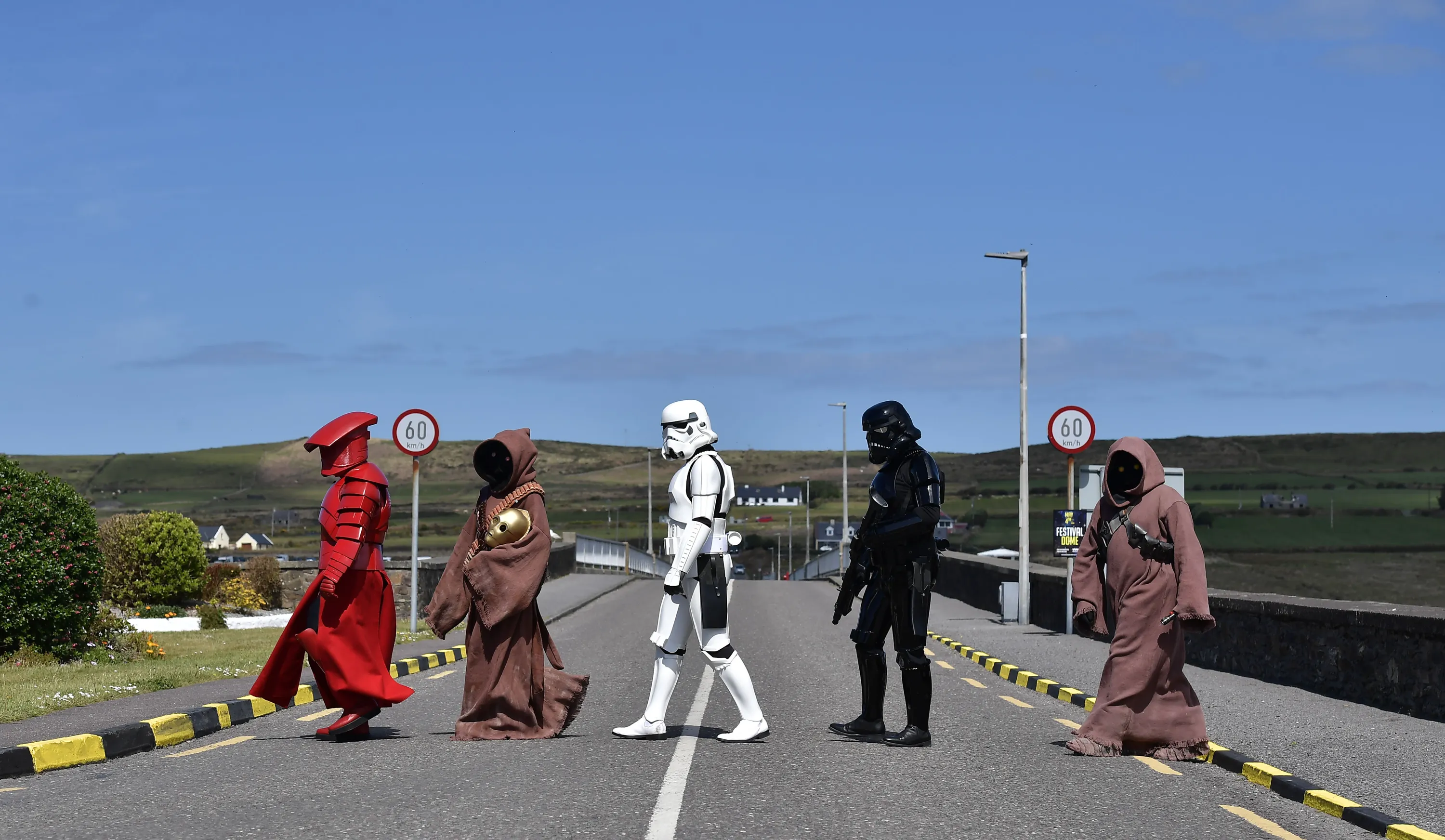 Members of the 501st Garrison Ireland Legion cross the bridge as they patrol the small fishing village on May 5, 2019 in Portmagee, Ireland. The latest Star Wars movies such as The Last Jedi have featured the famous Skellig Michael islands situated off the coast of the small Irish fishing village. The May the Fourth Star Wars festival is taking place this weekend in the small County Kerry village for the second year running as millions of fans worldwide celebrate the science fiction series. The quiet coastal setting has seen a sharp rise in the number of tourists and fans visiting the area. (Photo by Charles McQuillan/Getty Images)