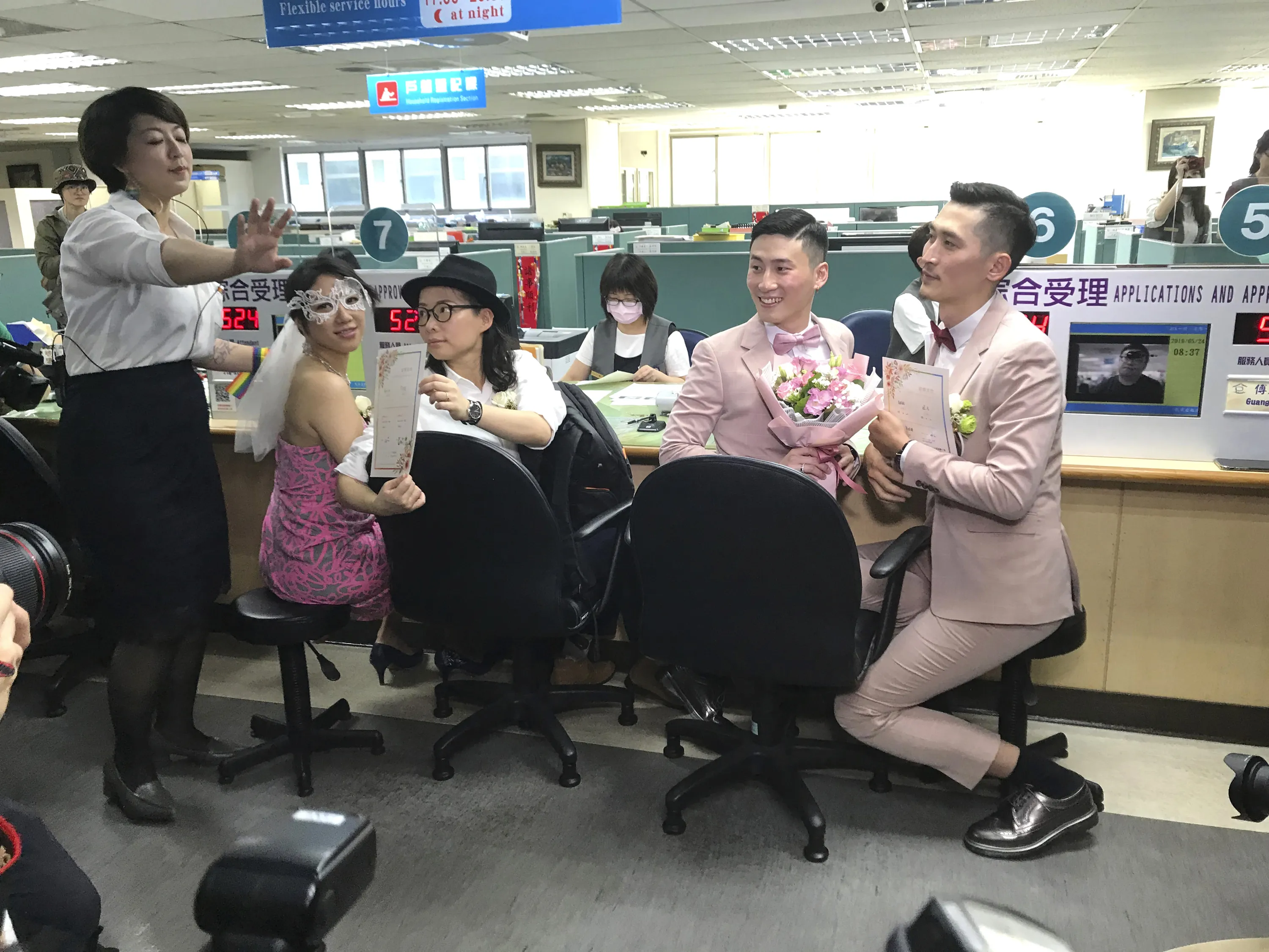 Two same-sex couples show their legal marriage certificates at the registration office in Xingyi District in Taipei, Taiwan, Friday, May 24, 2019. Hundreds of same-sex couples in Taiwan are rushing to the household registration office on the first day that a landmark decision to legalize same-sex marriage has taken effect. (Photo by Johnson Lai/AP Photo)