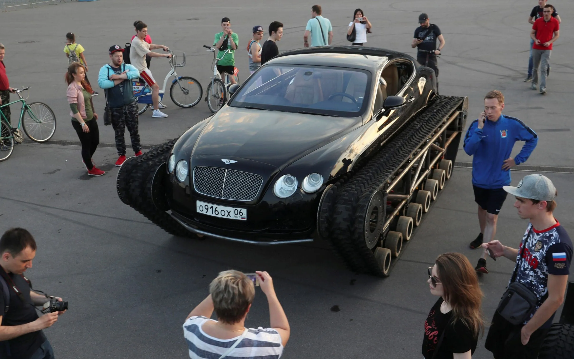 People gather around a caterpillar-tracked Bentley Continental GT, which was modified by Russian car engineering enthusiasts, during a demonstration in St. Petersburg, Russia on June 7, 2019. (Photo by Anton Vaganov/Reuters)