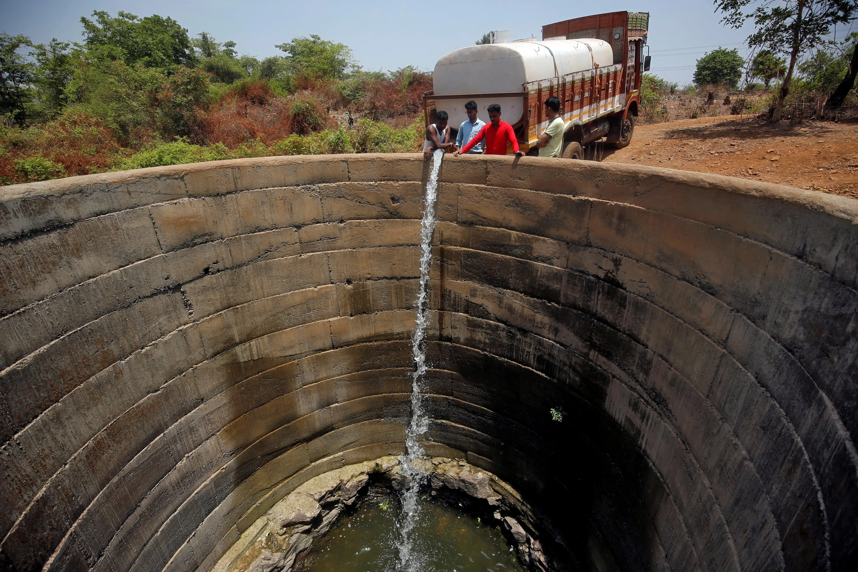 A dried-up well is refilled with water from a water tanker in Thane district in Maharashtra, May 30, 2019. (Photo by Francis Mascarenhas/Reuters)