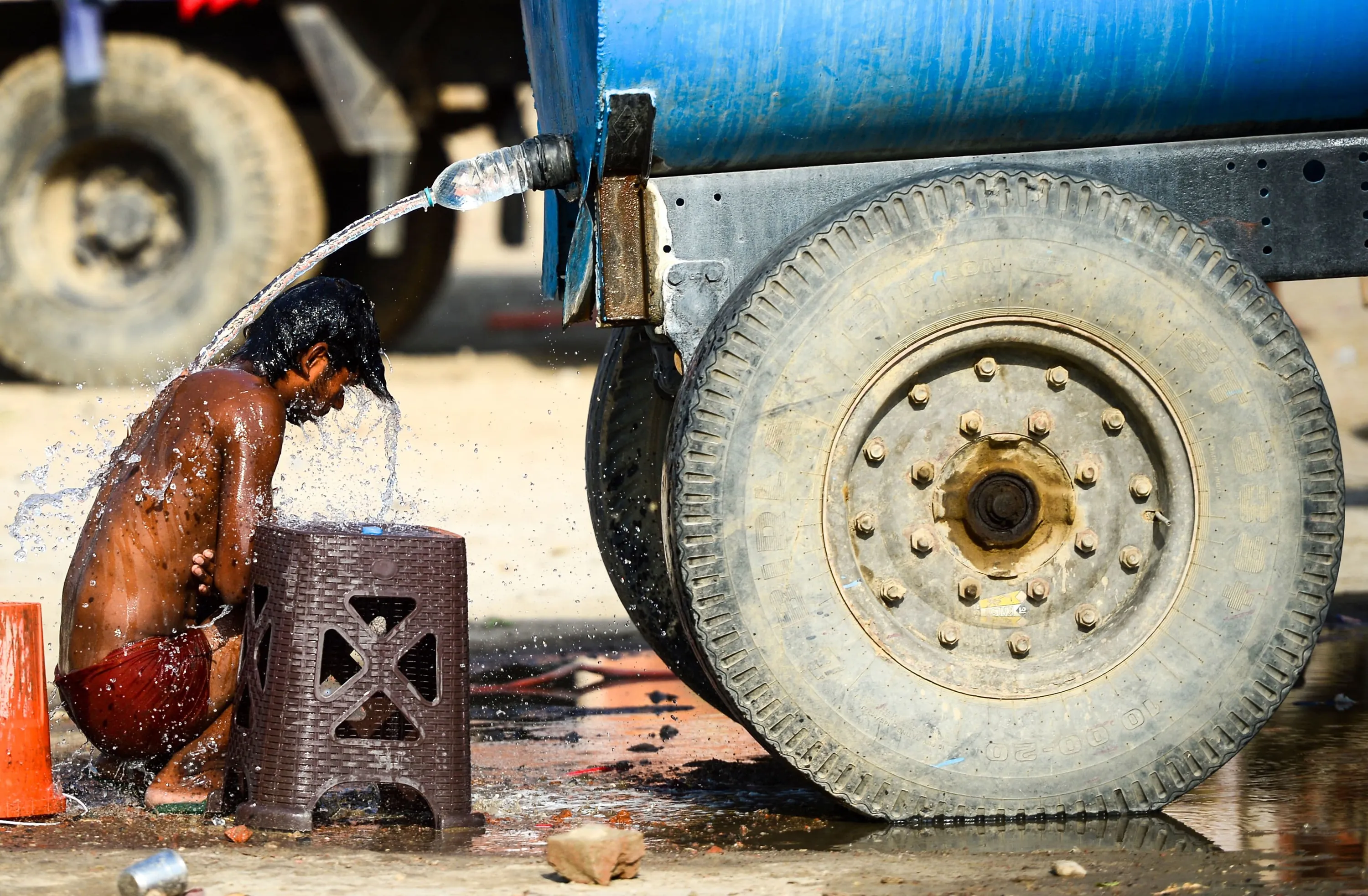 In this file photo taken on May 31, 2019, an Indian truck driver takes a bath using a water tanker as he tries to cool himself on a hot summer afternoon in Allahabad. Temperatures pushed towards 50 degrees Celsius (122 Fahrenheit) across much of India on June 1 as an unrelenting heatwave triggered warnings of water shortages and heat stroke. (Photo by Sanjay Kanojia/AFP Photo)