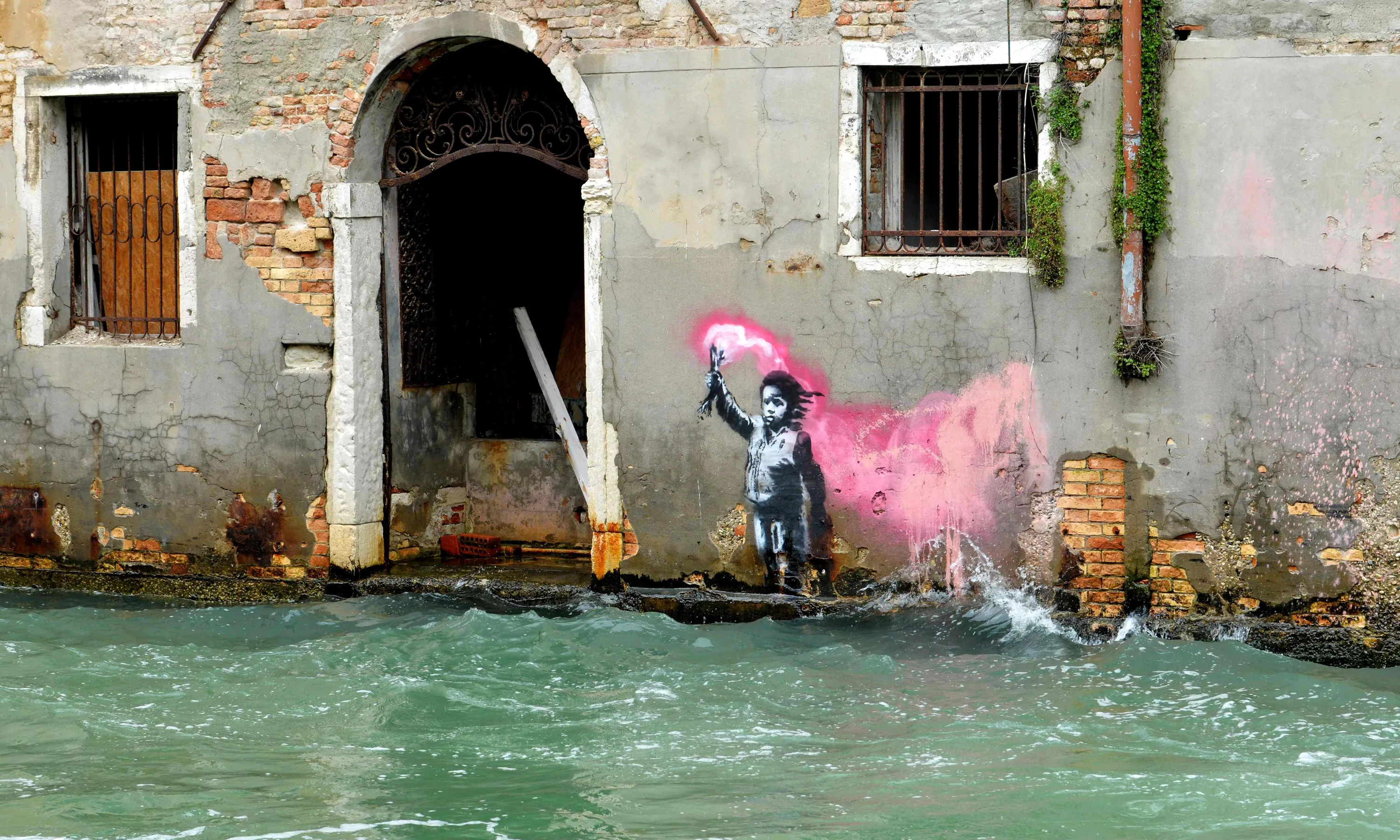 An alleged work by British street artist Banksy depicting a migrant child wearing a lifejacket holding a pink flare, is painted on the outer wall of a house overlooking the canal Rio de Ca Foscari, in Venice, on May 21, 2019. (Photo by Marco Sabadin/AFP Photo)