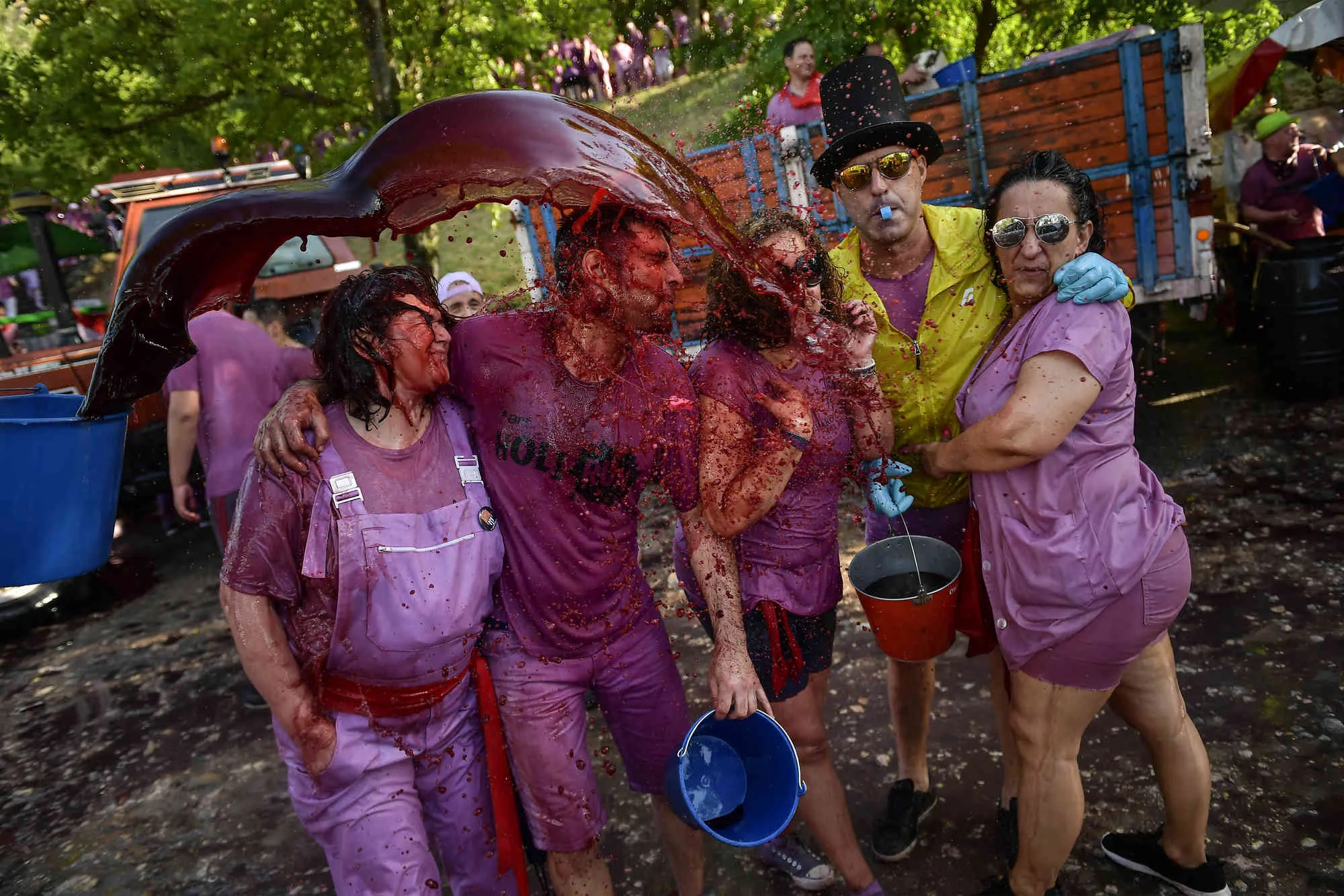 Revelers are covered in wine as people take part in a wine battle, in the small village of Haro, northern Spain, Saturday, June 29, 2019. Hundreds of revelers participate in this famous summer battle throwing thousands of liters of red wine over each other. (Photo by Alvaro Barrientos/AP Photo)