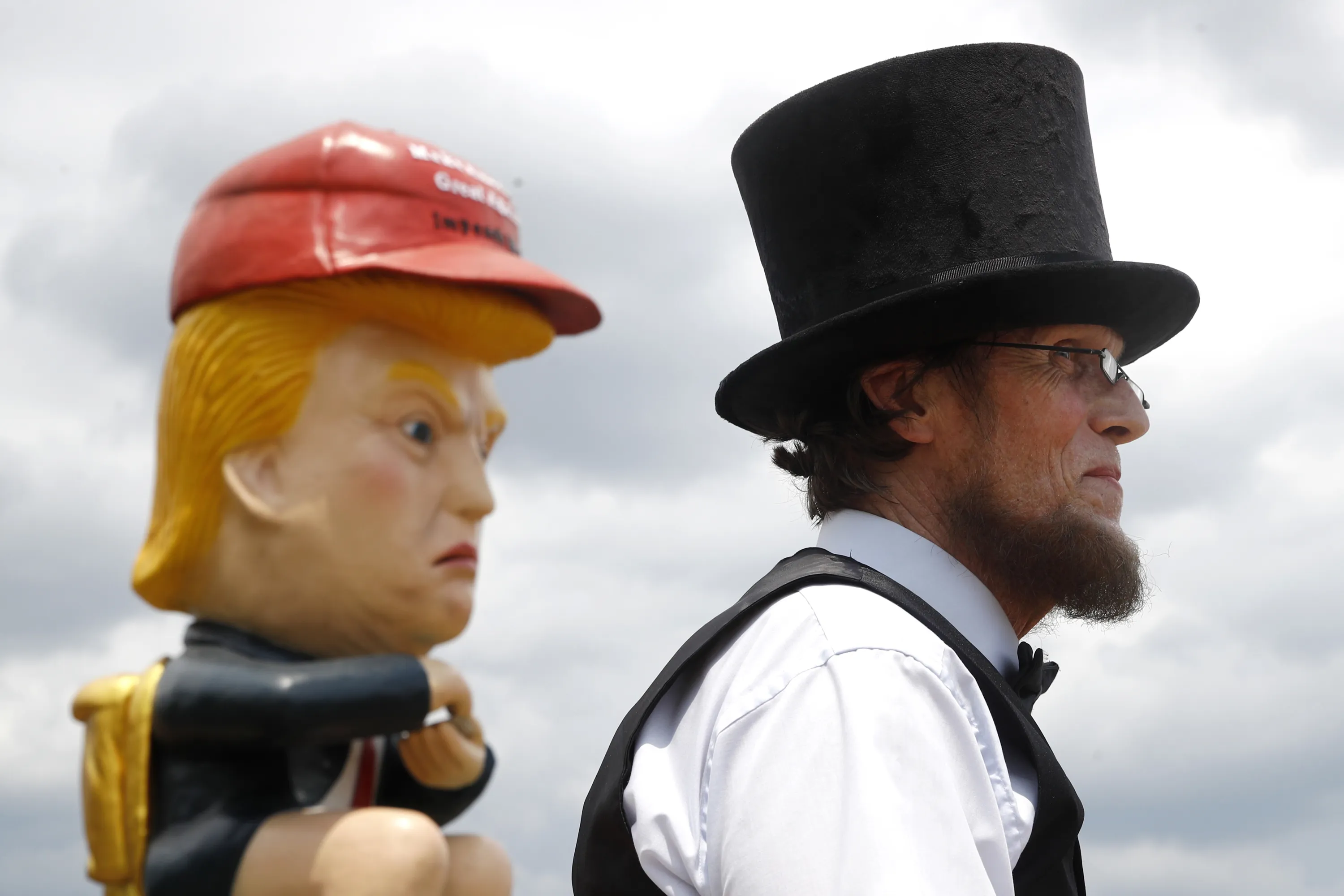Everett Loud, of Corning, N.Y., and dressed as President Abraham Lincoln, stands near a sculpture of President Donald Trump holding a cell phone while sitting on a toilet before Independence Day celebrations, Thursday, July 4, 2019, on the National Mall in Washington. (Photo by Patrick Semansky/AP Photo)