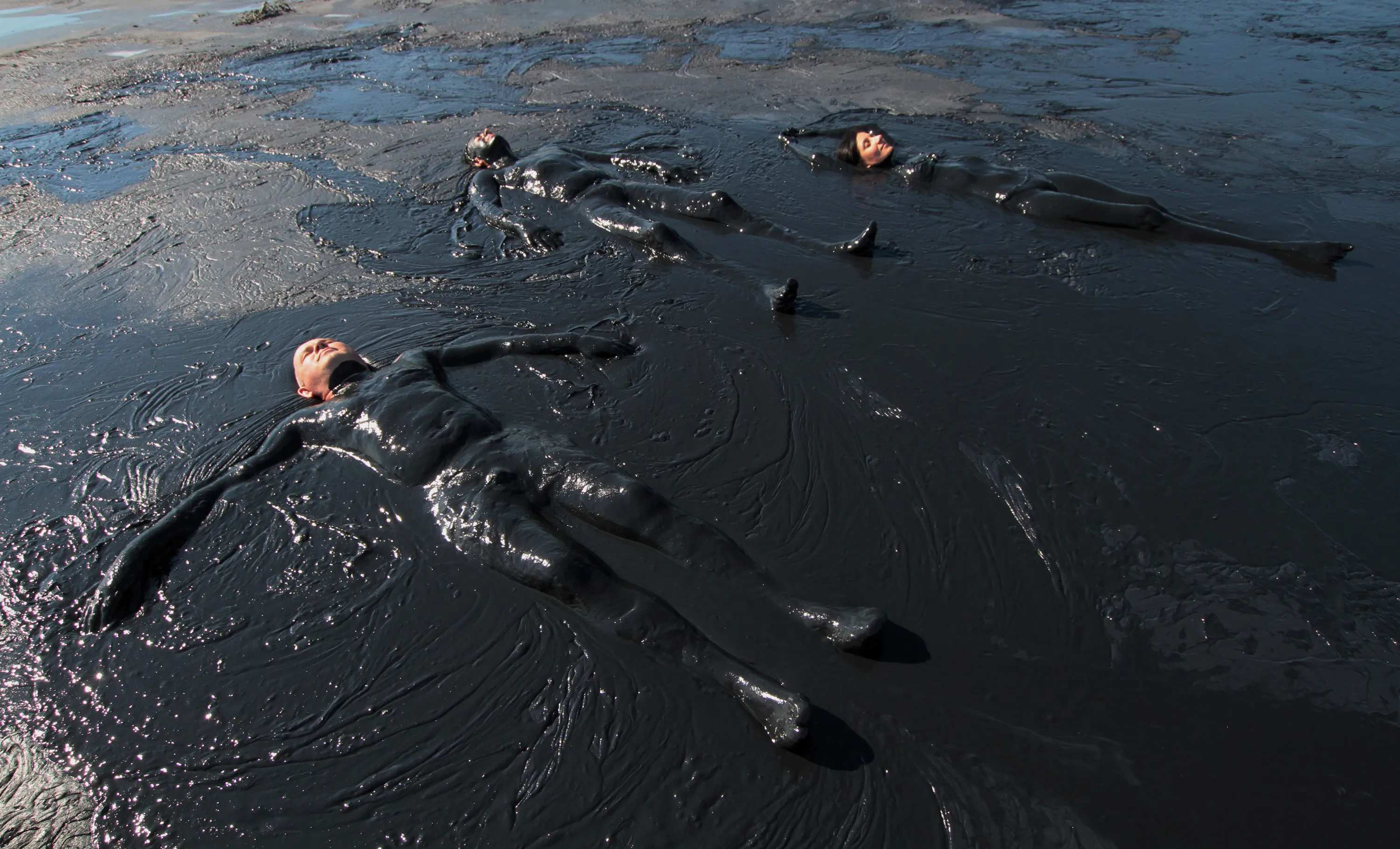 People take a mud bath in the Chokrak lake near the village of Kurortnoye on the Kerch peninsula, Crimea on July 7, 2019. (Photo by Alexey Pavlishak/Reuters)