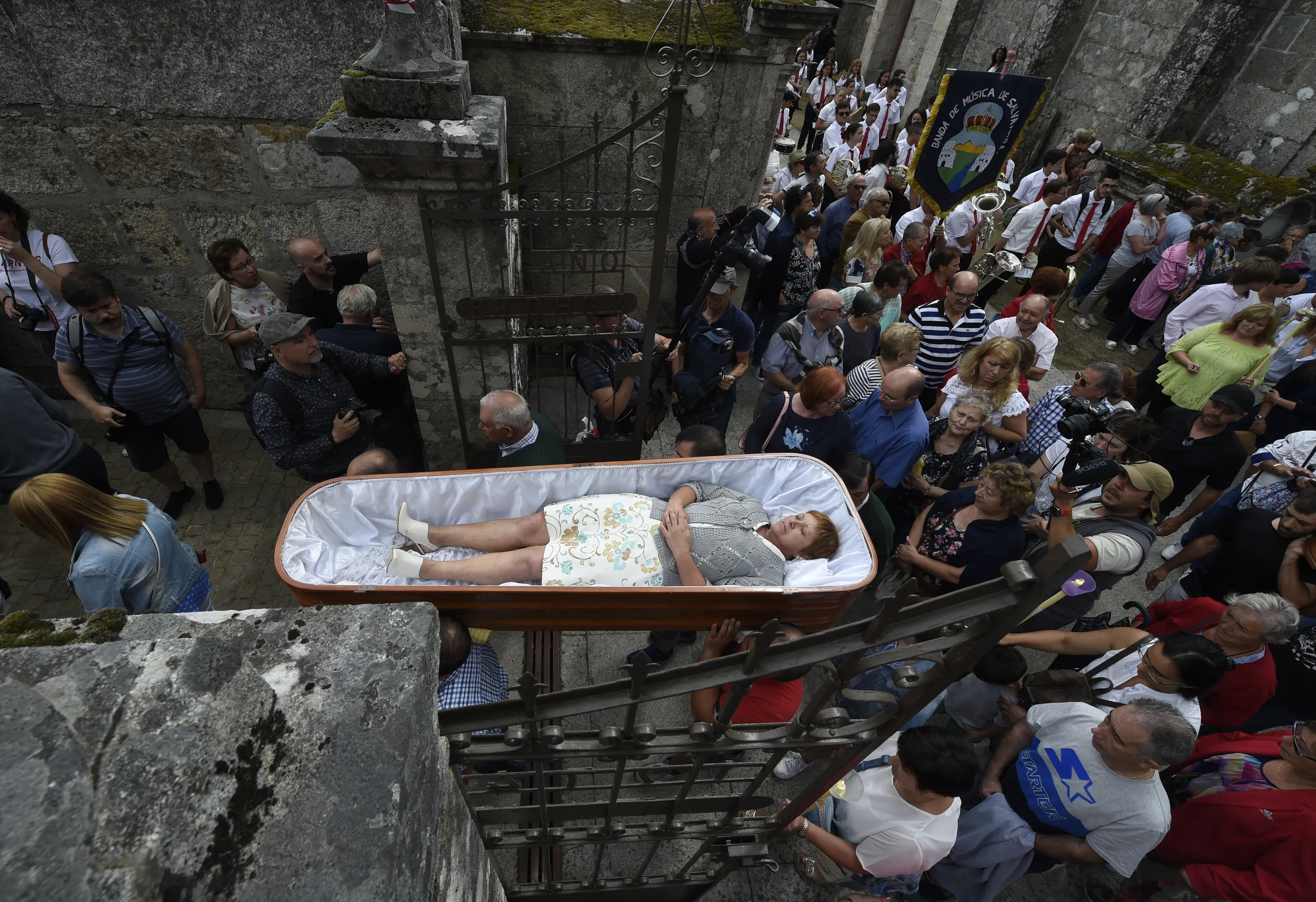 A woman is carried in a coffin by relatives during the annual “Procession of the Shrouds” to celebrate Saint Martha “the Saint of resurrection” in the village of Santa Marta de Ribarteme, northwestern Spain, near Nieves, on July 29, 2019. People who have escaped death lie in caskets and are carried in procession by relatives in a thankful gesture for being kept alive. (Photo by Miguel Riopa/AFP Photo)