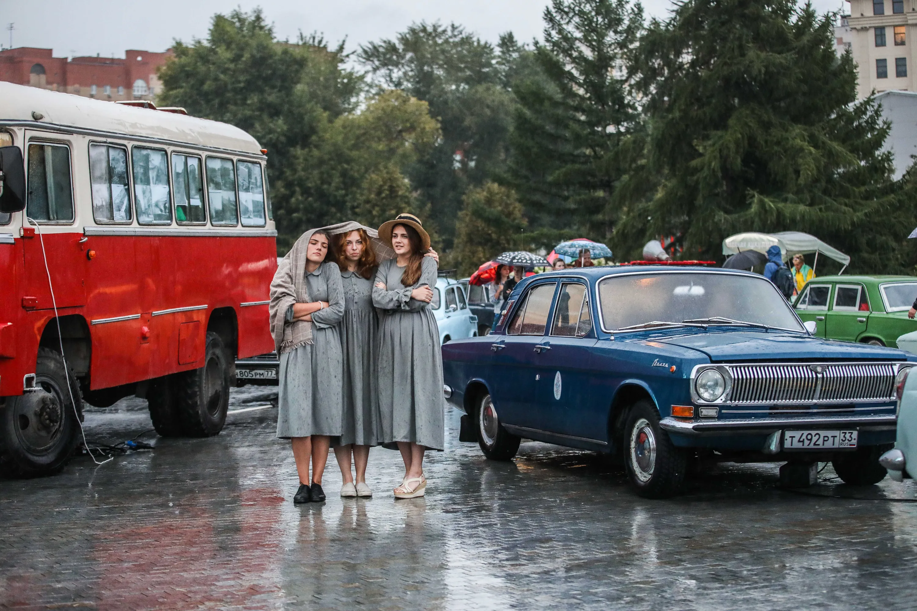 Actresses take part in a street performance in central Moscow, Russia, on August 7, 2019. “Probka Mira”, a street performance depicting a traffic jam, took place in Muzeon park of central Moscow on Wednesday. Around 200 actors took part in the performance. (Photo by Maxim Chernavsky/Xinhua News Agency/Barcroft Media)
