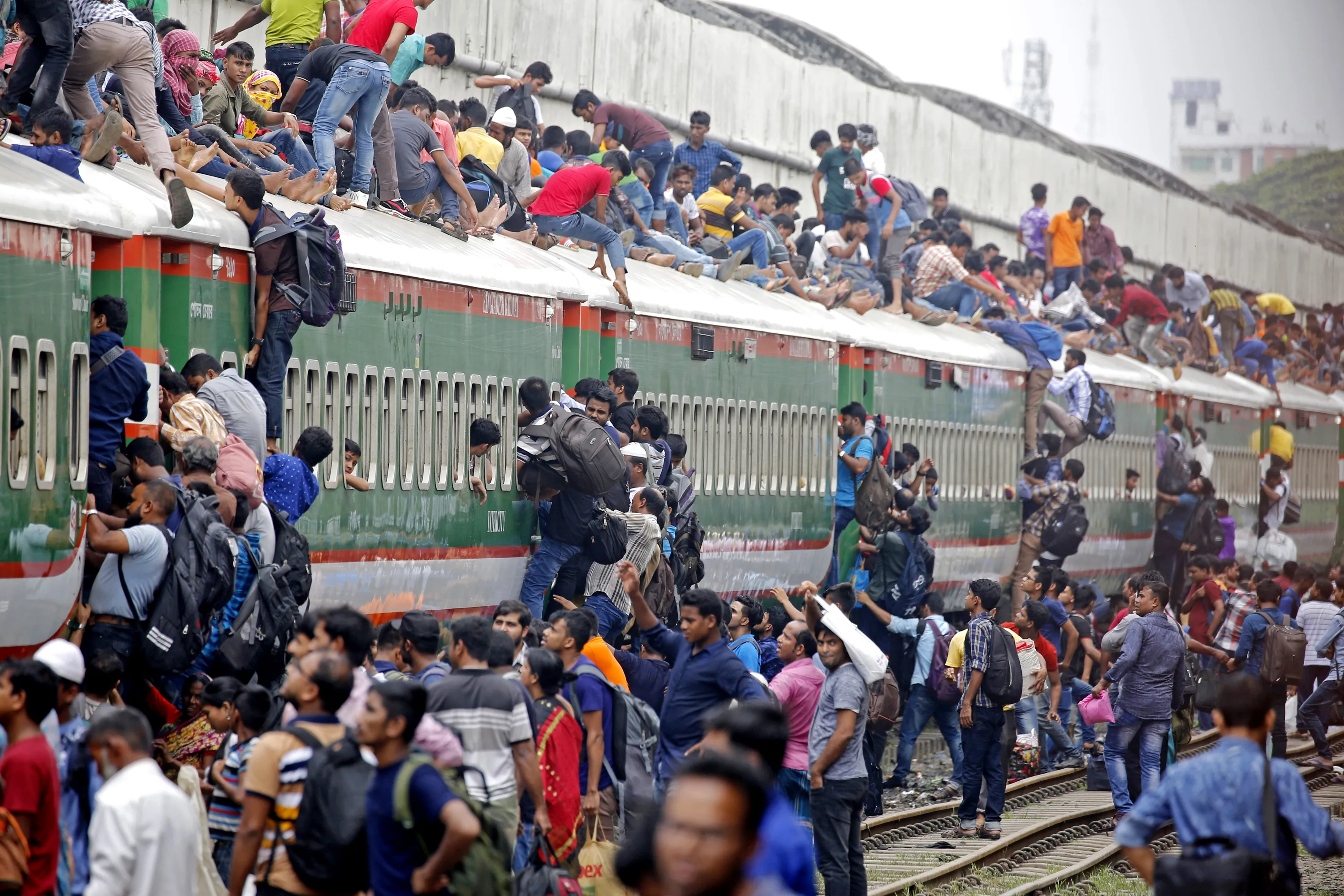 Bangladeshi people climb on the roof of an overcrowded train as they travel to their home villages to celebrate Eid-al-Adha, at the Kamlapur Railway Station in Dhaka, Bangladesh, 09 August 2019. Eid al-Adha is the holiest of the two Muslims holidays celebrated each year, it marks the yearly Muslim pilgrimage (Hajj) to visit Mecca, the holiest place in Islam. Muslims slaughter a sacrificial animal and split the meat into three parts, one for the family, one for friends and relatives, and one for the poor and needy. (Photo by Monirul Alam/EPA/EFE)