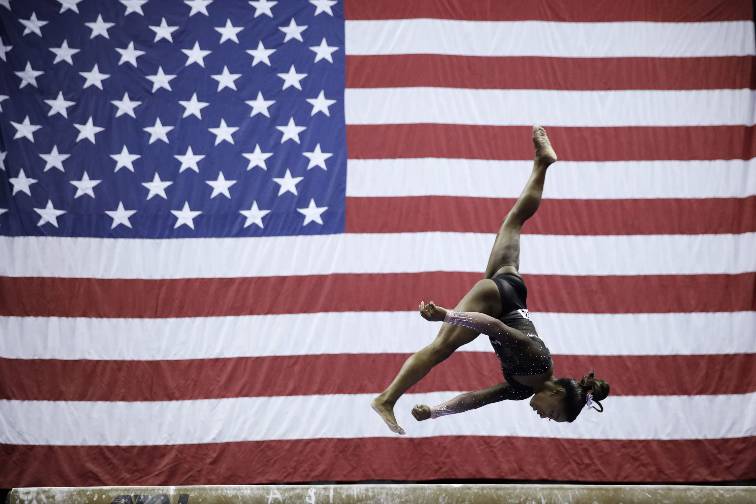 Simone Biles competes in the beam during the senior women's competition at the 2019 U.S. Gymnastics Championships Sunday, August 11, 2019, in Kansas City, Mo. (Photo by Charlie Riedel/AP Photo)