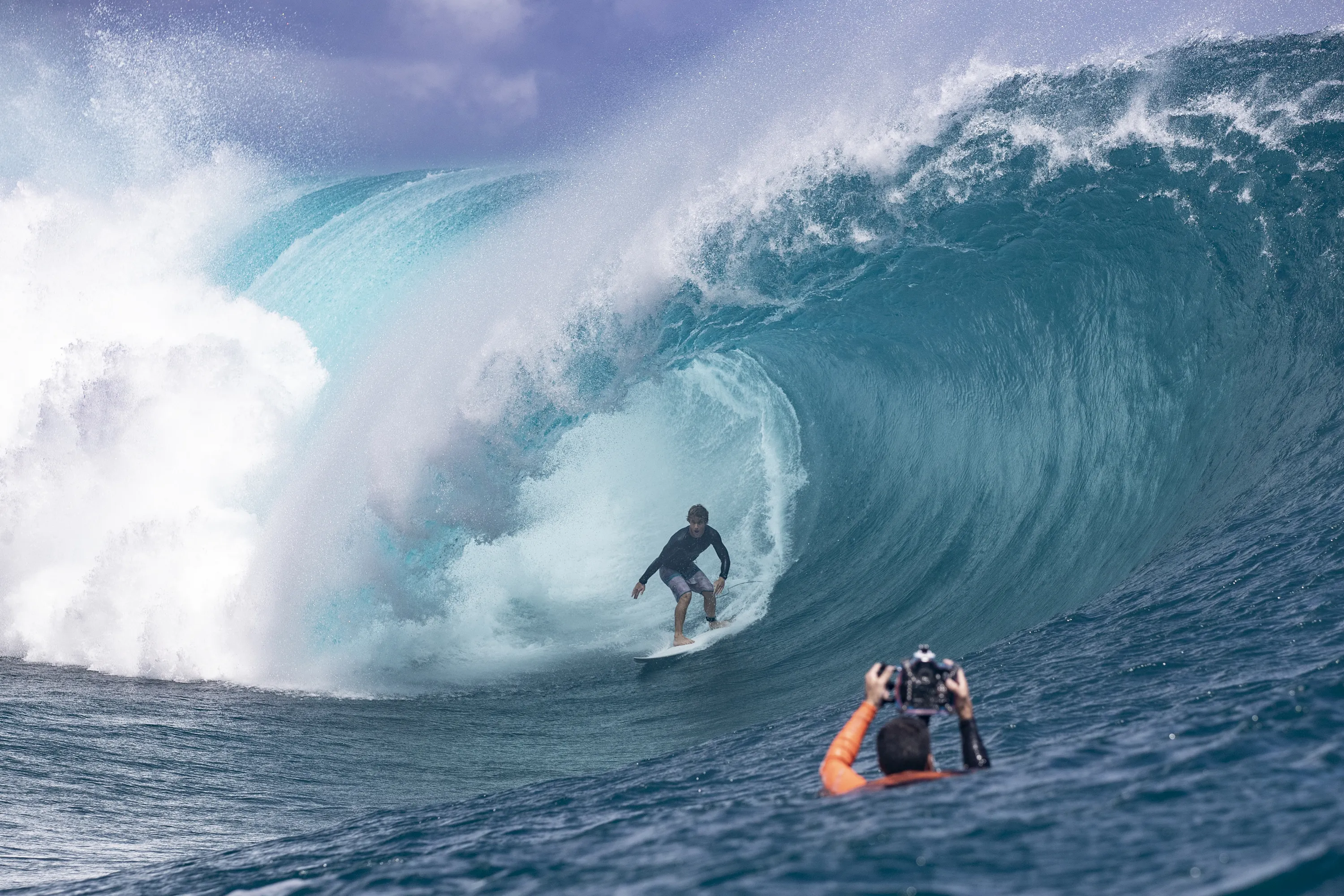 Us surfer Benji Brand from Hawaii practices next to a photographer taking pictures ahead of the Tahiti pro surfing trial at the famous break Teahupoo in Tahiti, French Polynesia on August 18, 2019. (Photo by Brian Bielmann/AFP Photo)