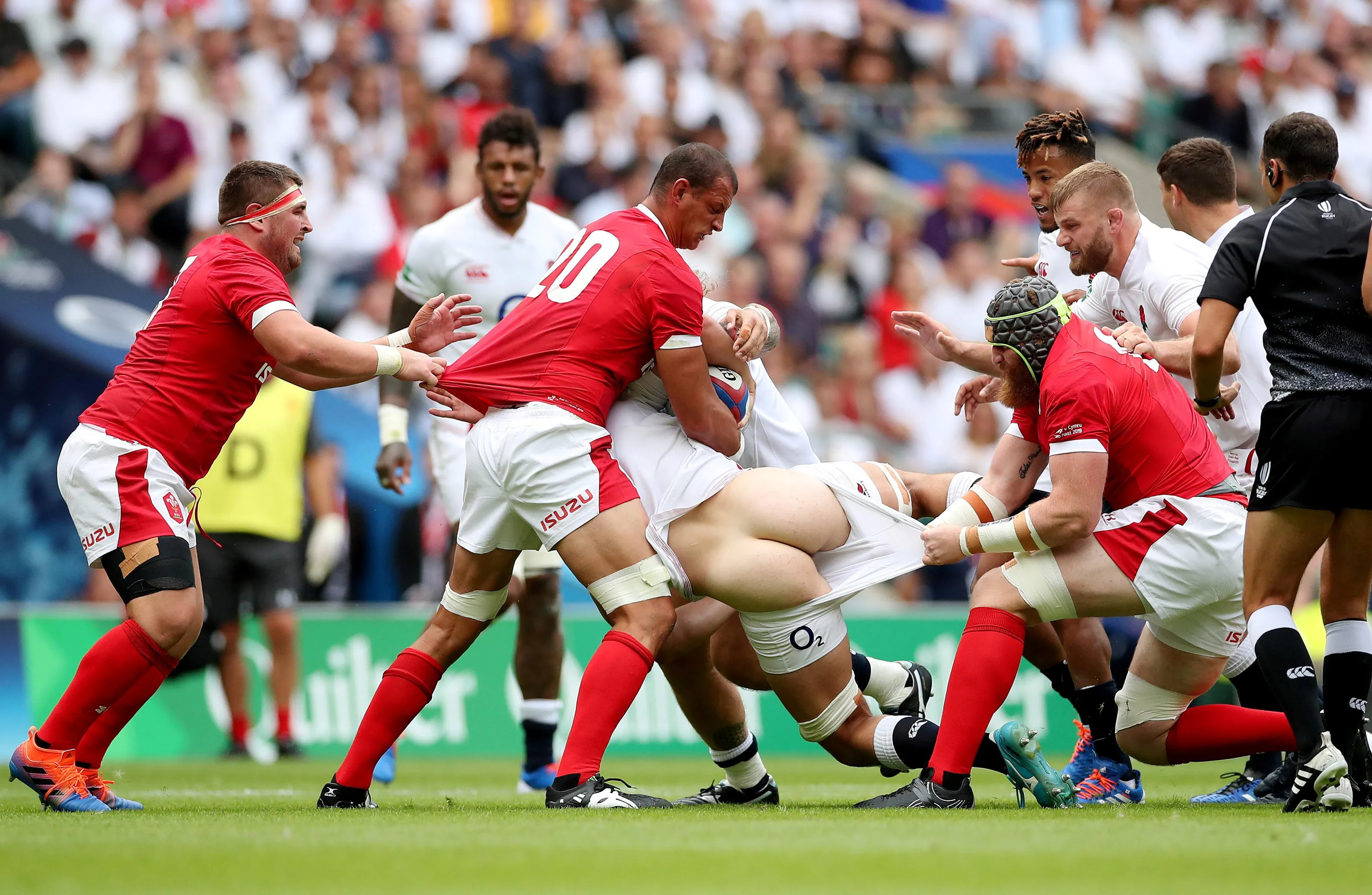 England's Charlie Ewels in action with Wales' Aaron Shingler during a Rugby World Cup warm-up match at Twickenham Stadium in Twickenham, Britain, August 11, 2019. (Photo by Peter Cziborra/Action Images via Reuters)