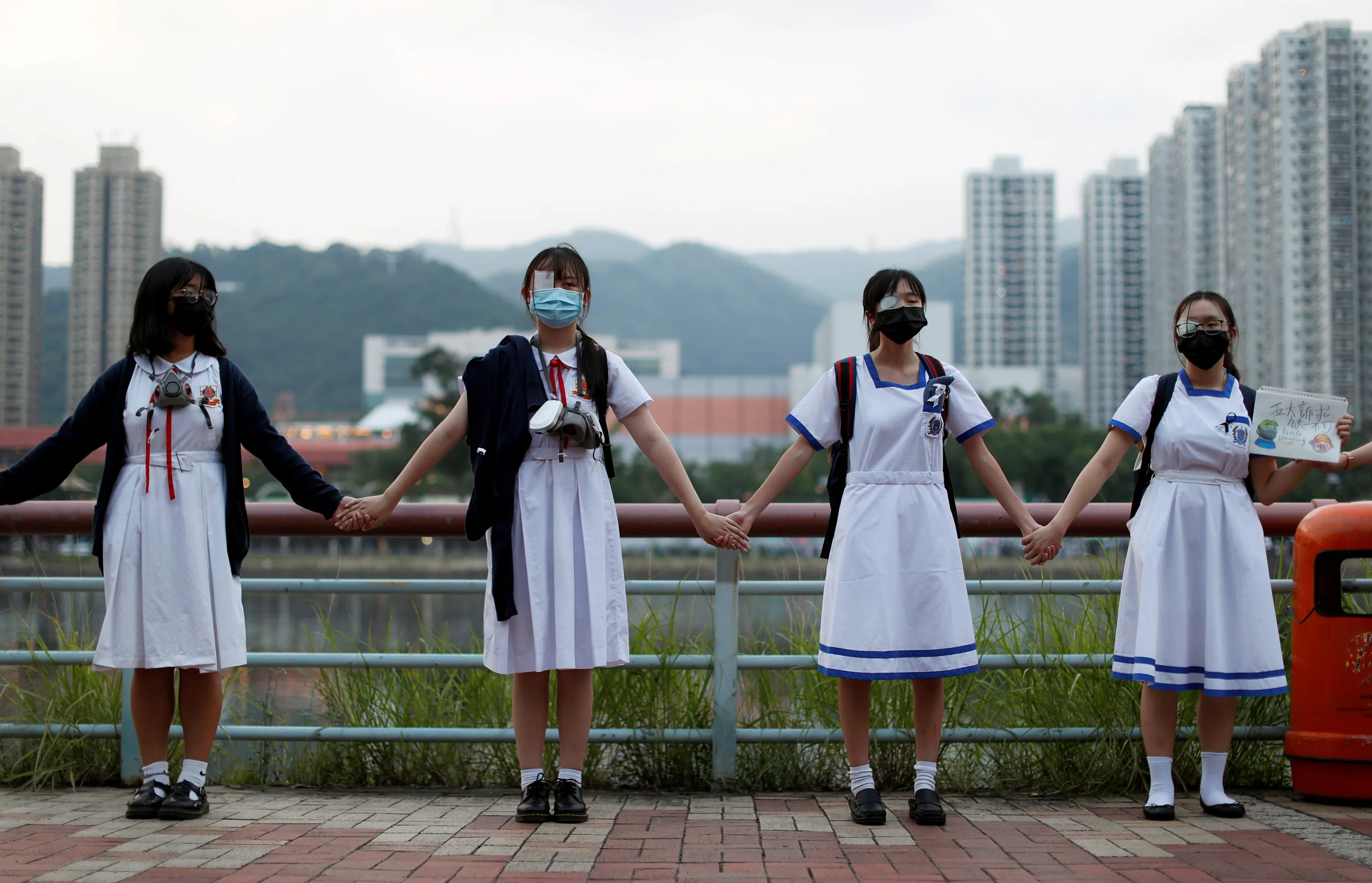 Anti-government protesters hold hands to prepare a human chain in Sha Tin at the banks of the Shing Mun River in Hong Kong, China on September 19, 2019. China's foreign ministry on Thursday accused U.S. congressional leader Nancy Pelosi of making irresponsible remarks about pro-democracy protests in Hong Kong, one day after she welcomed activists from the city to the U.S. Capitol. (Photo by Jorge Silva/Reuters)
