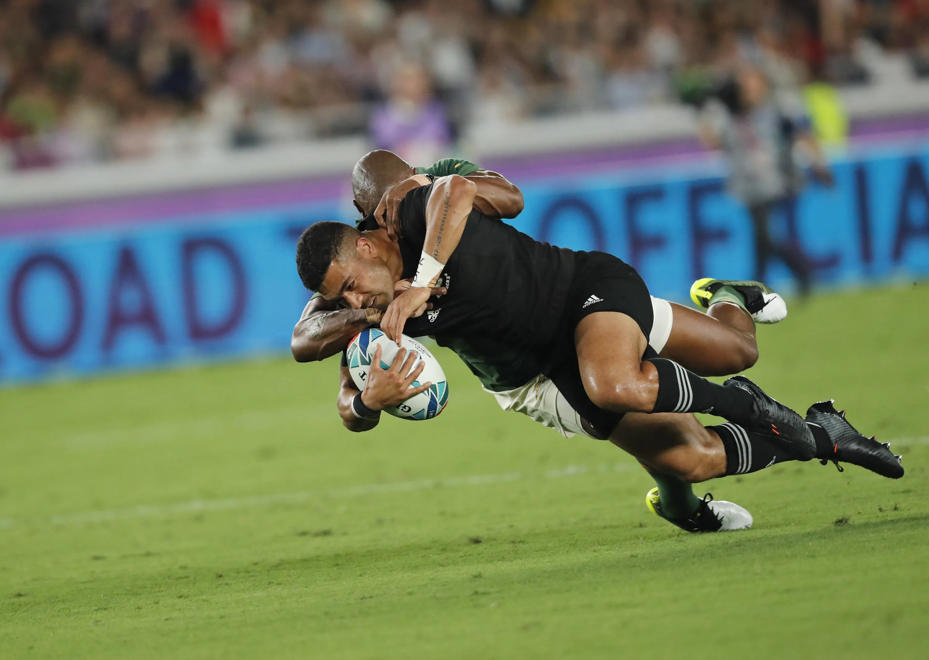 New Zealand's Richie Mo'unga is tackled by South Africa's Makazole Mapimpi during the Rugby World Cup Pool B game between New Zealand and South Africa in Yokohama, Japan, Saturday, September 21, 2019. (Photo by Shuji Kajiyama/AP Photo)