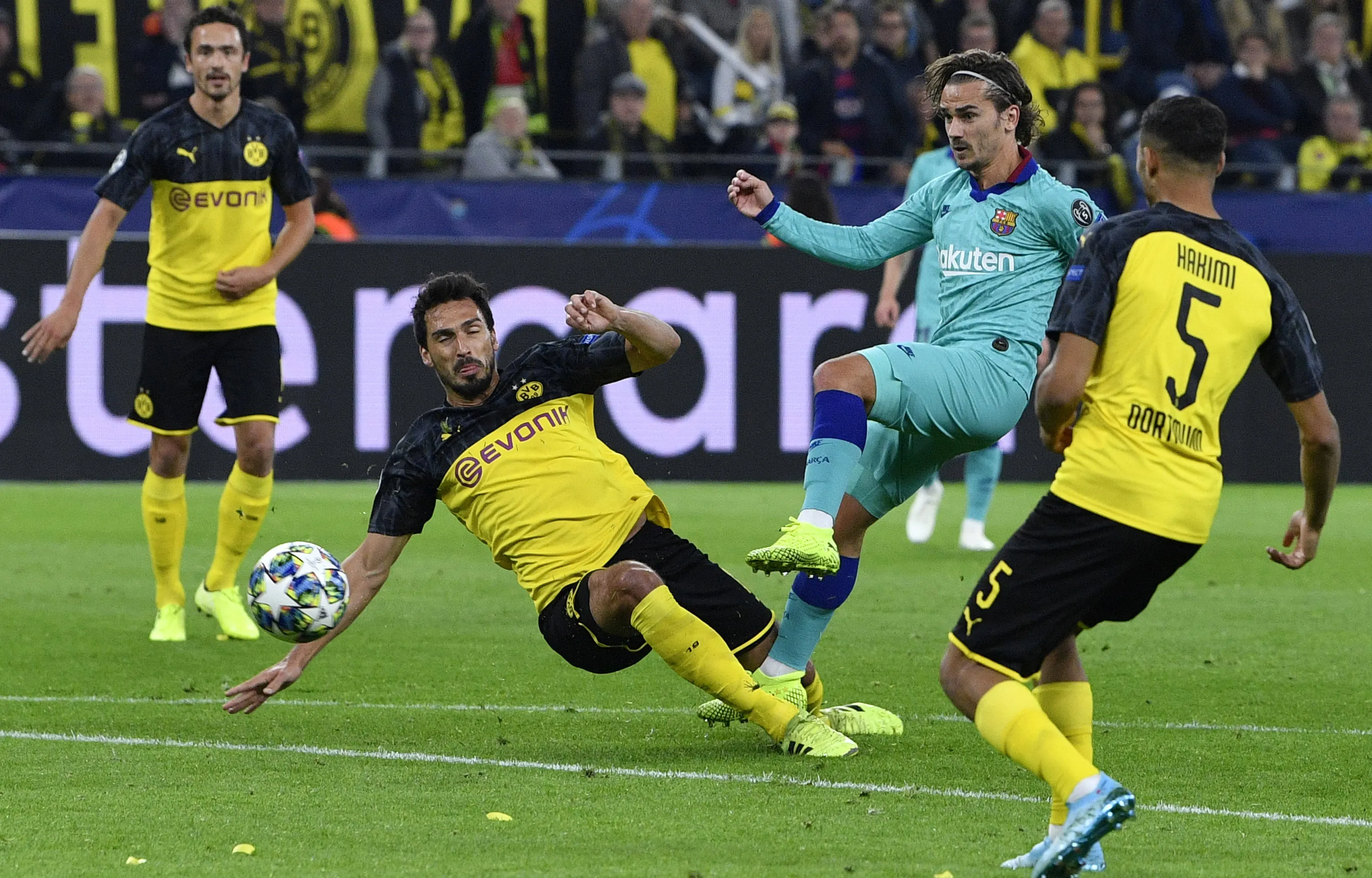 Barcelona's Antoine Griezmann, second right, attempts a shot at goal in front of Dortmund's Mats Hummels during the Champions League Group F soccer match between Borussia Dortmund and FC Barcelona in Dortmund, Germany, Tuesday September 17, 2019. (Photo by Martin Meissner/AP Photo)