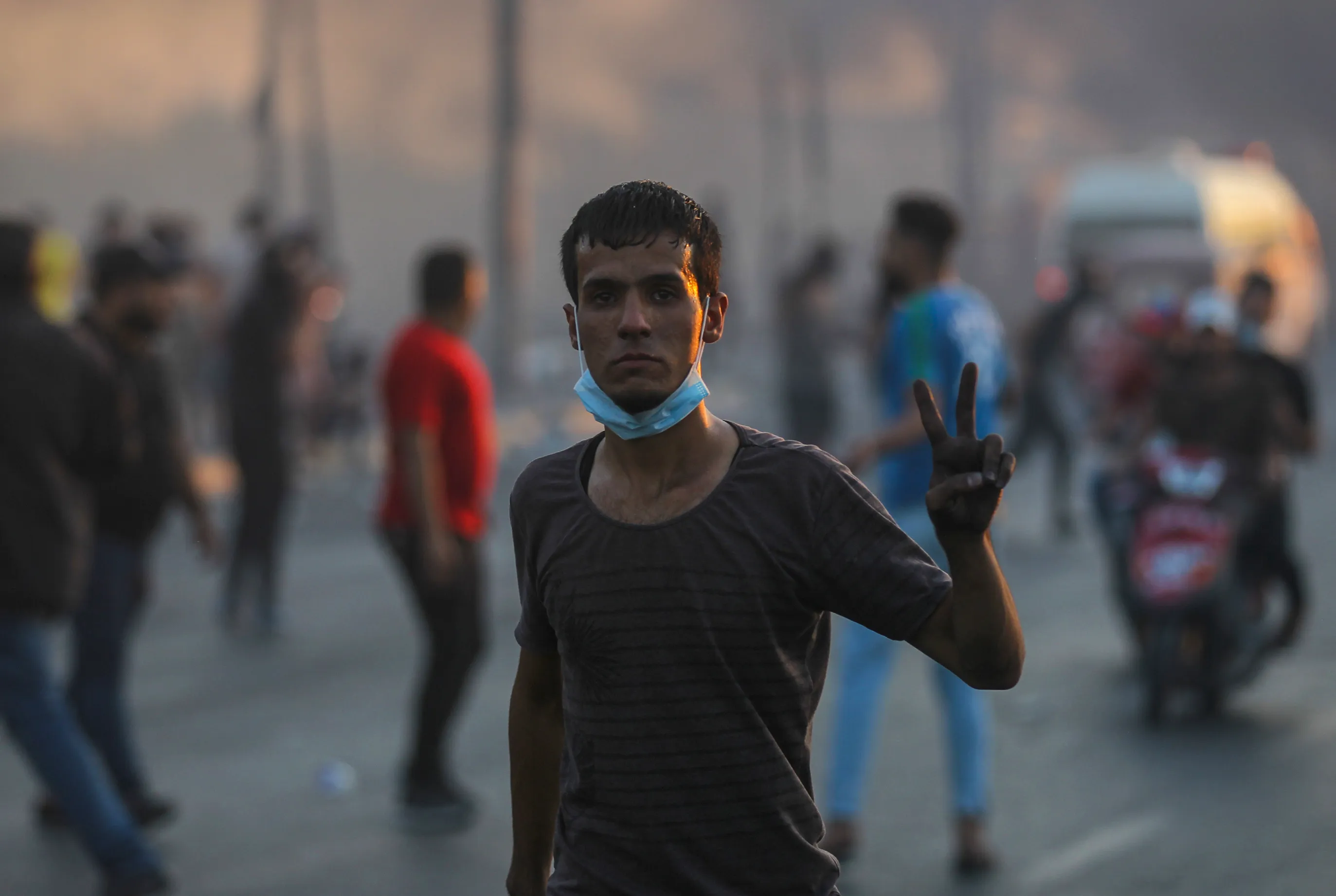 An Iraqi demonstrator gestures with the v-sign for victory during a demonstration against state corruption, failing public services, and unemployment, in the Iraqi capital Baghdad on October 5, 2019. Renewed protests took place under live fire in Iraq's capital and the country's south Saturday as the government struggled to agree a response to days of rallies that have left nearly 100 dead. The largely spontaneous gatherings of demonstrators -- whose demands have evolved since they began on Tuesday from employment and better services to fundamental government change -- have swelled despite an internet blackout and overtures by the country's elite. Hours after a curfew in Baghdad was lifted on Saturday morning, dozens of protesters rallied around the oil ministry in the capital, facing live rounds fired in their direction, an AFP photographer said. (Photo by Ahmad Al-Rubaye/AFP Photo)