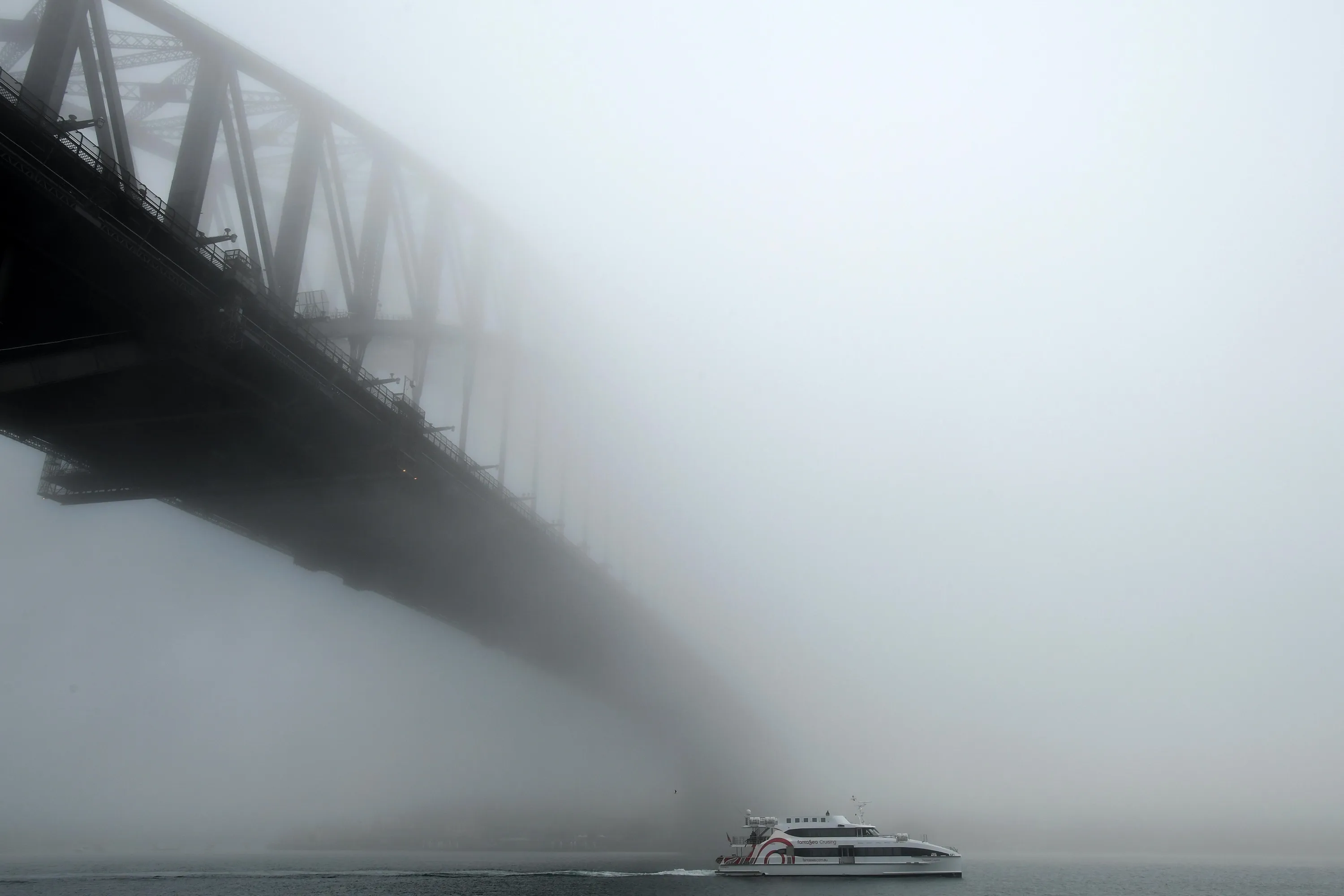 A boat passes under the Sydney Harbour Bridge during heavy morning fog in Sydney, Australia, 07 July 2019. (Photo by Joel Carrett/EPA/EFE)