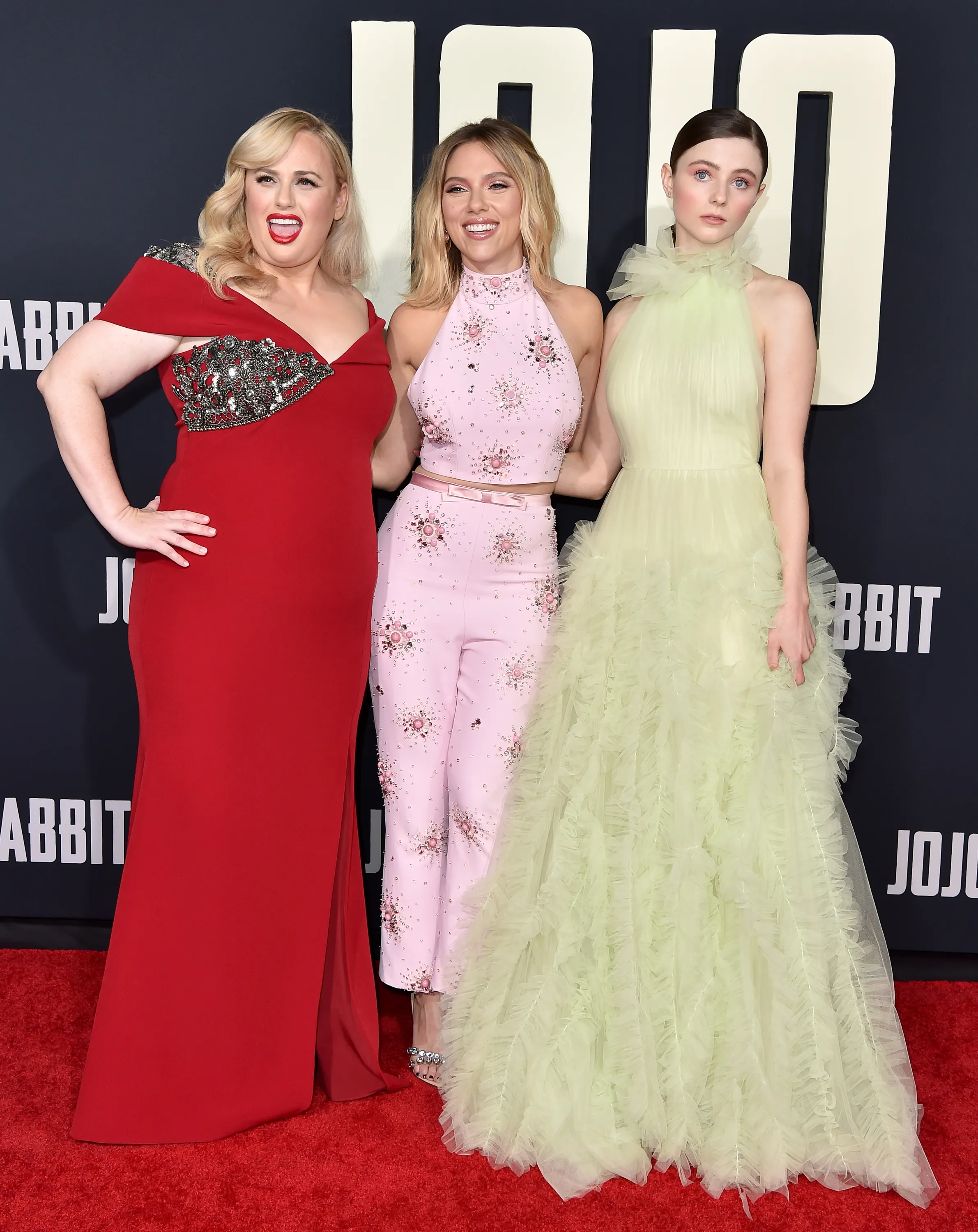 (L-R) Rebel Wilson, Scarlett Johansson, and Thomasin McKenzie attend the Premiere of Fox Searchlights' “Jojo Rabbit” at Post 43 on October 15, 2019 in Los Angeles, California. (Photo by Axelle/Bauer-Griffin/FilmMagic)