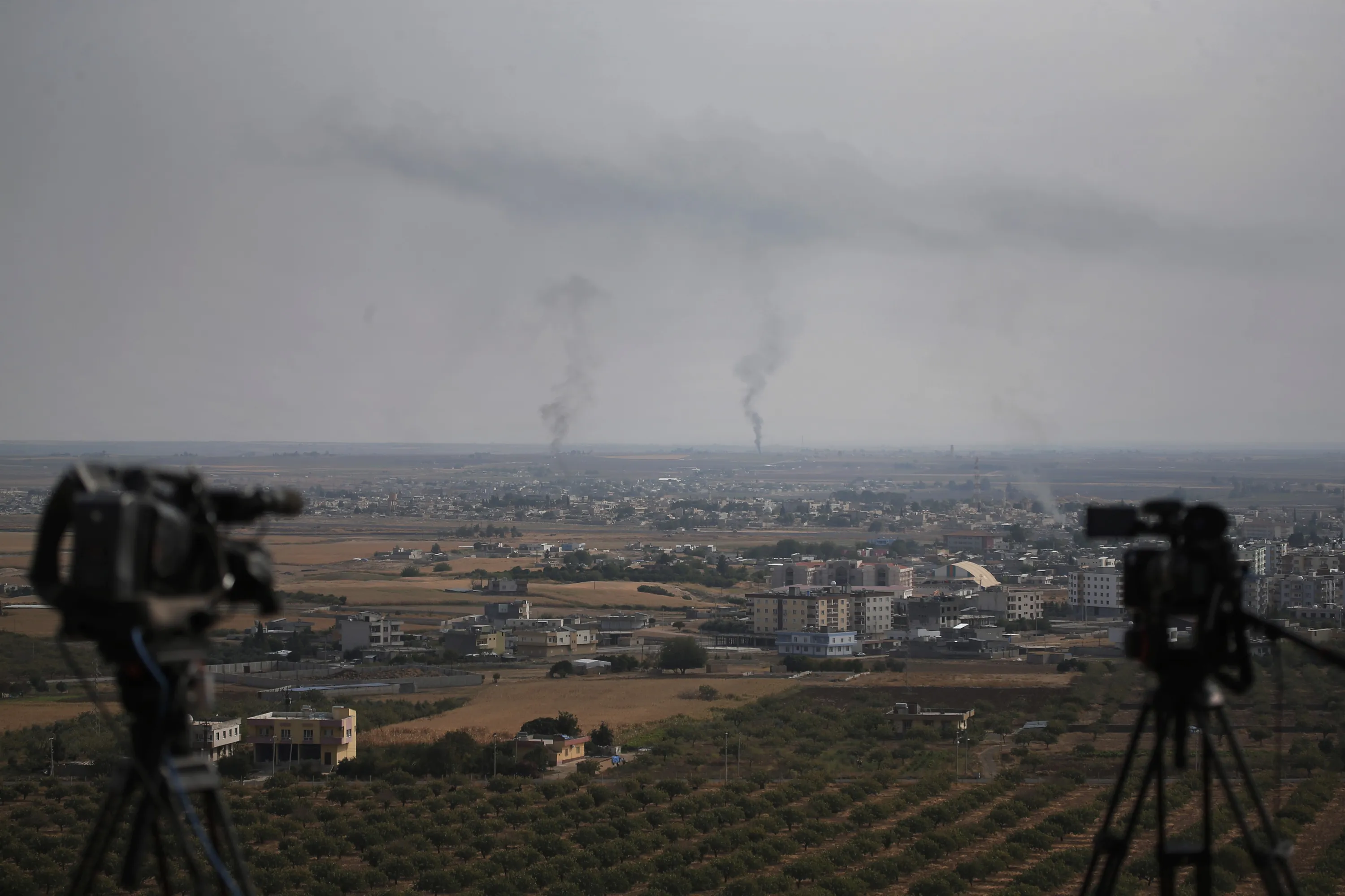 TV cameras are seen on a hilltop in Ceylanpinar, Sanliurfa province, southeastern Turkey, as in the background smoke billows from fires in Ras al-Ayn, Syria, Sunday, October 20, 2019. Turkey's defense ministry says one soldier has been killed amid sporadic clashes with Kurdish fighters in northern Syria, despite a U.S.-brokered cease-fire. The ministry also said it allowed a 39-vehicle humanitarian convoy to enter Ras al-Ayn, a key border town that's seen some of the heaviest fighting. (AP Photo/Lefteris Pitarakis)