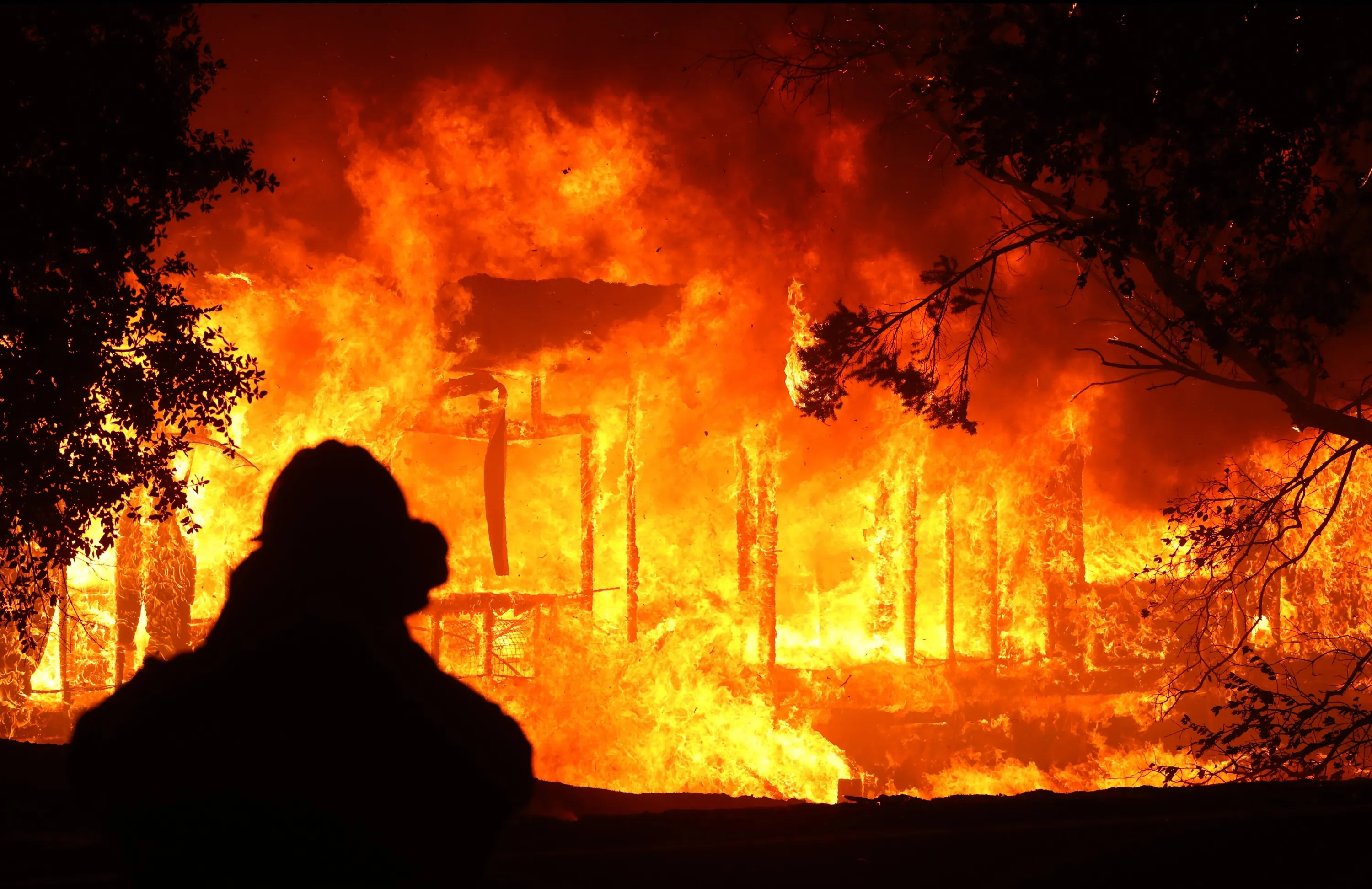 A home burns as the Kincade Fire moves through the area on October 24, 2019 in Geyserville, California. Fueled by high winds, the Kincade Fire has burned over 7,000 acres in a matter of hours and has prompted evacuations in the Geyserville area. (Photo by Justin Sullivan/Getty Images)