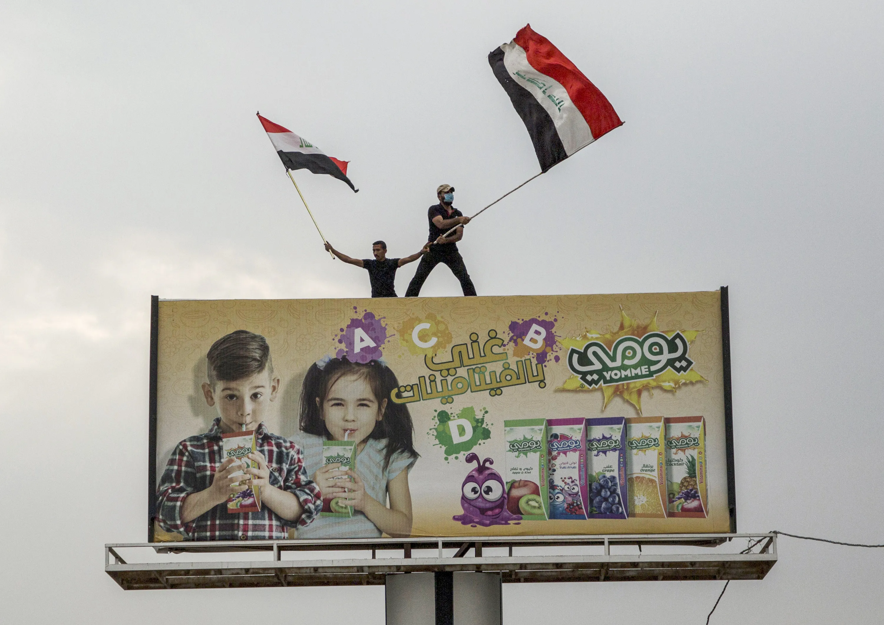 Iraqi protesters wave national flags as they stand atop a billboard during an anti-government demonstration outside the local government headquarters in the southern city of Basra on October 25, 2019. More than a dozen demonstrators died in renewed rallies across Iraq's capital and the south, with the first reported use of live rounds in this wave of protests. (Photo by AFP Photo/Stringer)