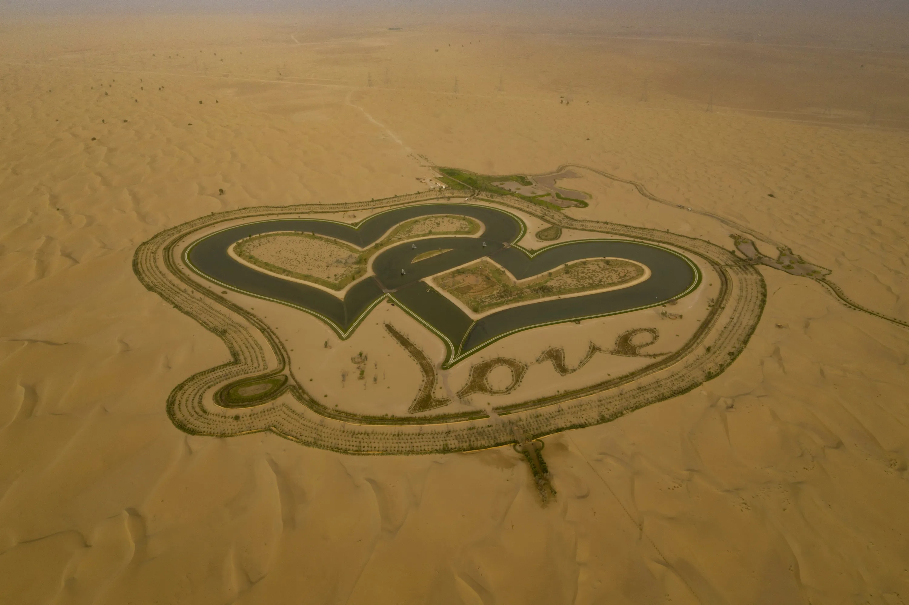 A picture taken with a drone on July 31, 2019, shows the new man-made “Love lake” at al-Qudra desert in the Gulf emirate of Dubai. (Photo by Giuseppe Cacace/AFP Photo)