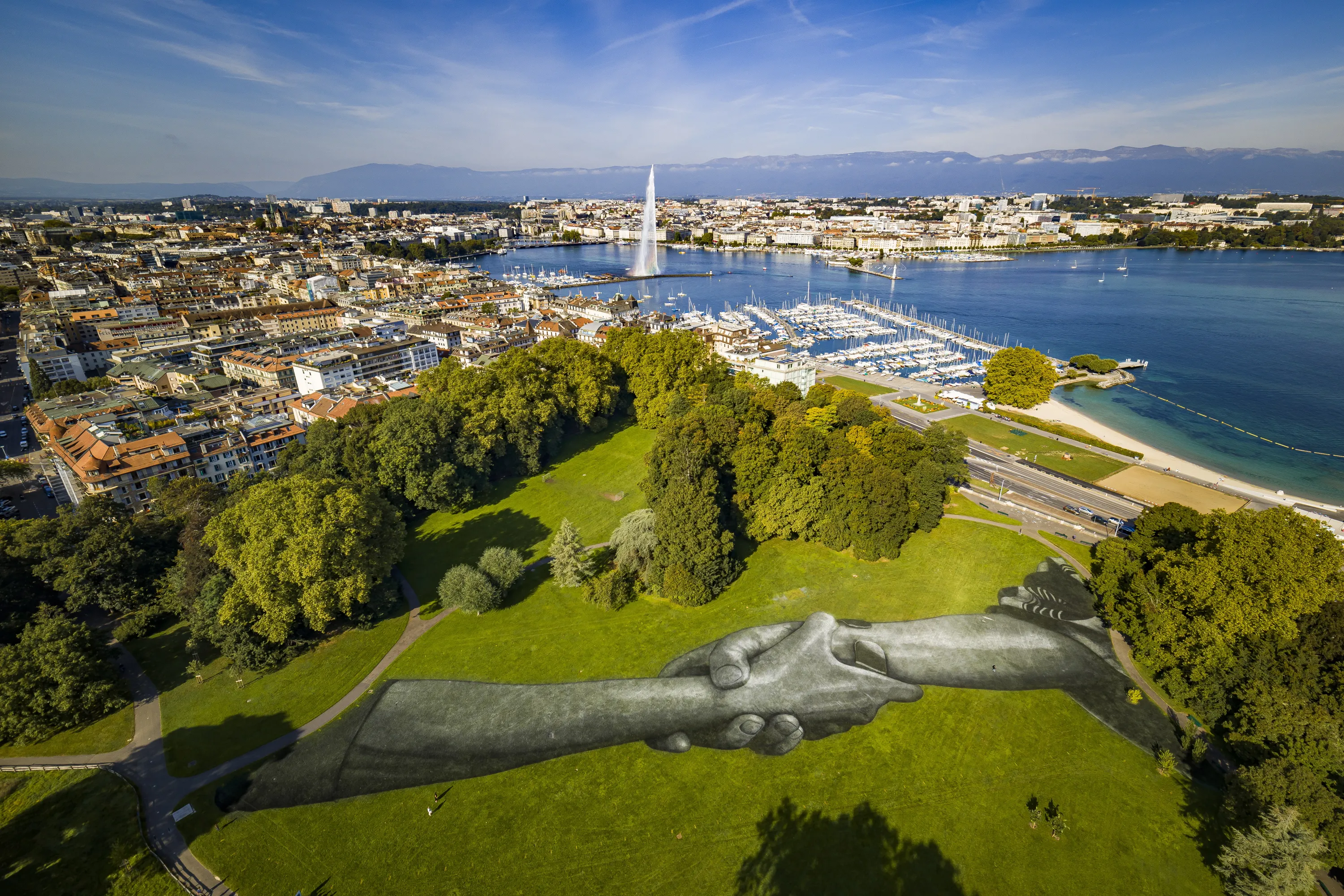 A picture taken with a drone shows a view of a giant biodegradable landart painting by French-Swiss artist Saype at the Parc de la Grange in Geneva, Switzerland, 14 September 2019. With an overall area of 5,000 square meters, the 165 meters long and 30 meters wide painting was created using biodegradable pigments made out of charcoal, chalk, water and milk proteins. Th3 art piece in the Parc de la Grange along with a second one in the Parc des Bastions marks the third step of the worldwide “Beyond Walls Project” aiming at creating the longest symbolic human chain around the world promoting values such as togetherness, kindness and openness to the world. (Photo by Valentin Flauraud/EPA/EFE)