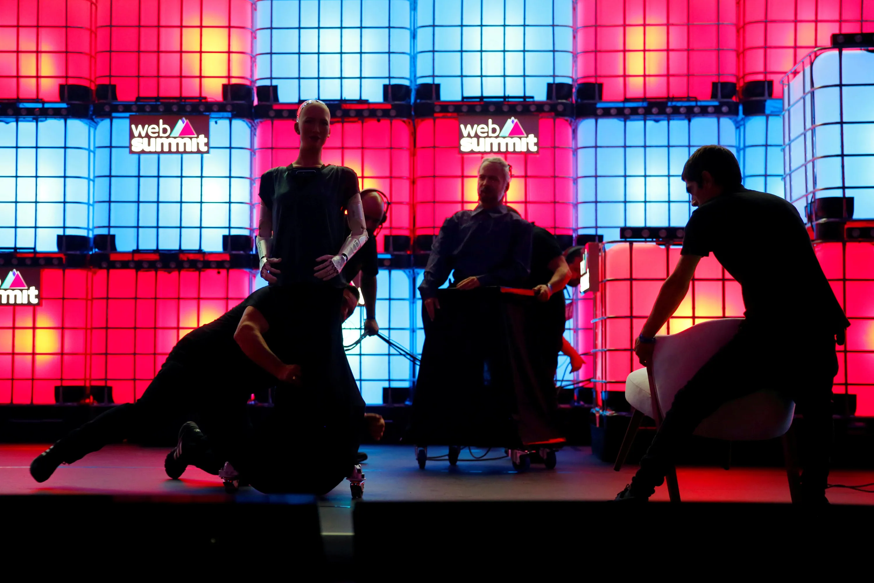 People remove Sophia The Robot and Philip K. Dick robot from the stage following Hanson Robotics presentation at Web Summit, in Lisbon, Portugal, November 6, 2019. (Photo by Pedro Nunes/Reuters)