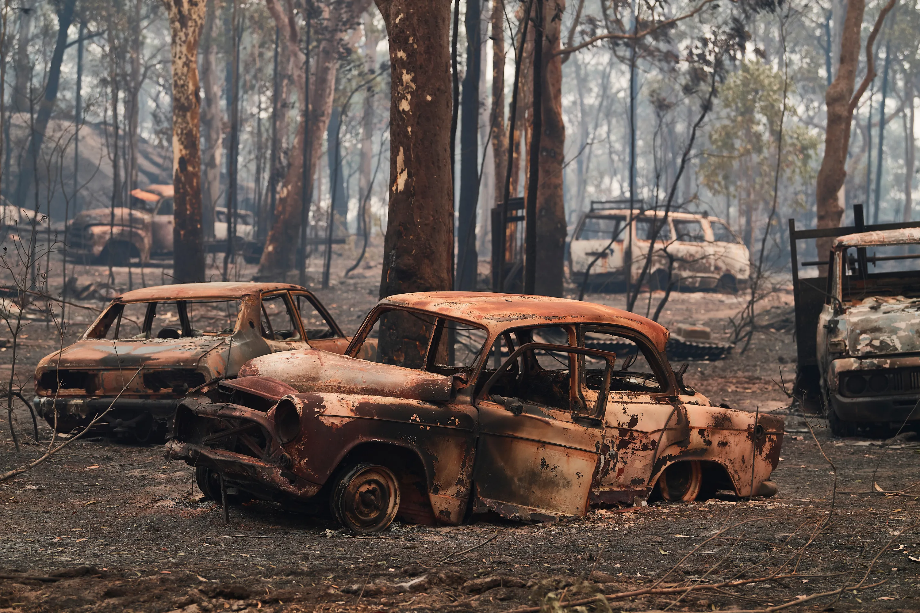 A burnt car on a vacant derelict property along Putty Road after devastating fires tore through areas near Colo Heights on November 14, 2019 in Sydney, Australia. Bushfires from the Gospers Mountain bushfire continue to burn. An estimated million hectares of land has been burned by bushfire following catastrophic fire conditions - the highest possible level of bushfire danger. While conditions have eased, fire crews remain on high alert as dozens of bushfires continue to burn. A state of emergency was declared by NSW Premier Gladys Berejiklian on Monday 11 November and is still in effect, giving emergency powers to Rural Fire Service Commissioner Shane Fitzsimmons and prohibiting fires across the state. (Photo by Brett Hemmings/Getty Images)