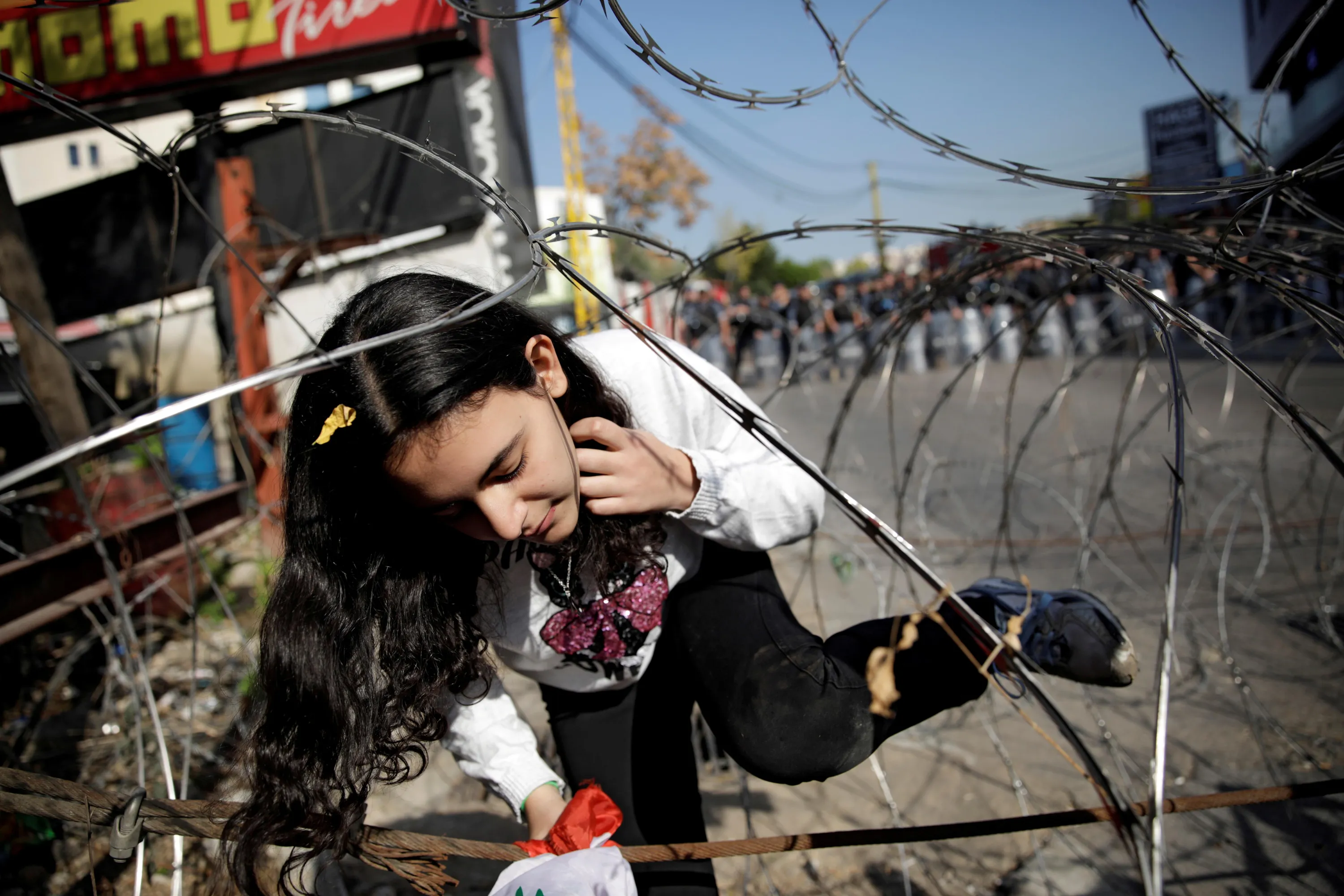 A girl walks among a barbed wire blocking the road to the U.S. Embassy during a protest in Awkar, Lebanon on November 24, 2019. (Photo by Andres Martinez Casares/Reuters)