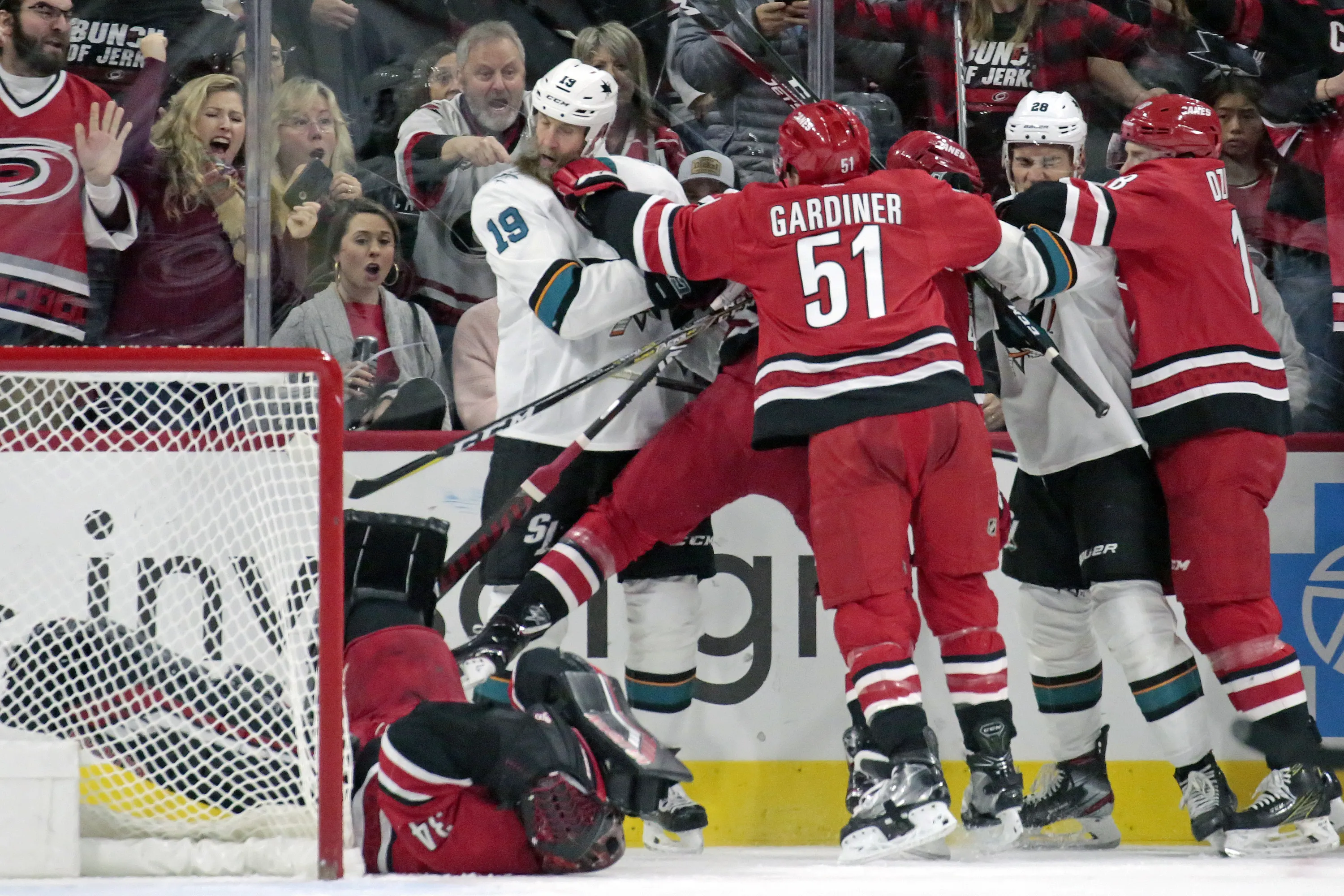 Carolina Hurricanes' Jake Gardiner (51) and Ryan Dzingel (18) tussle with San Jose Sharks' Joe Thornton (19) and Timo Meier (28) of Switzerland after Thornton knocked Carolina goaltender Petr Mrazek (34) of the Czech Republic to the ice during the second period of an NHL hockey game in Raleigh, N.C., Thursday, December 5, 2019. Thornton and Mrazek were penalized on the play. (Photo by Chris Seward/AP Photo)