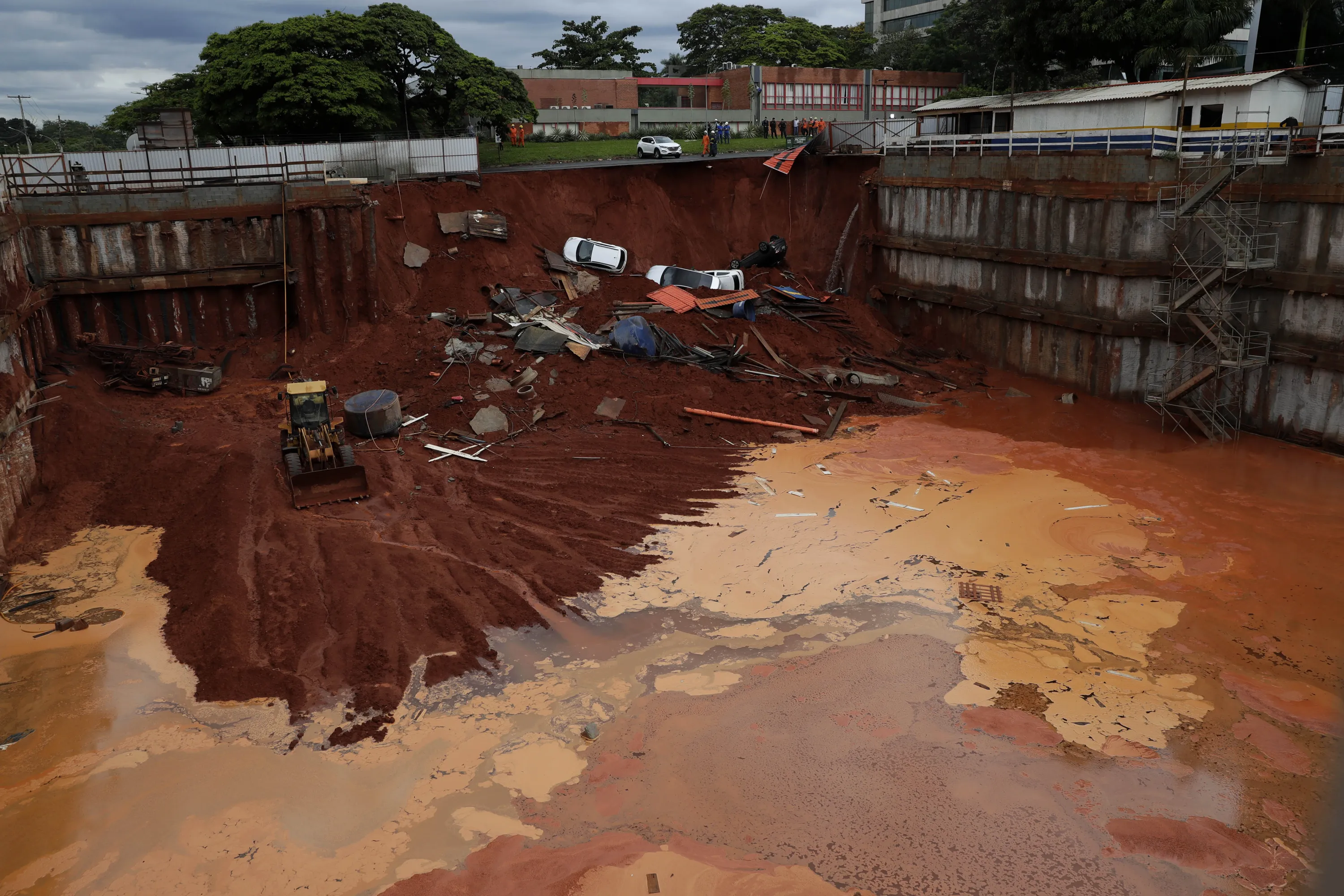 Vehicles lay at the bottom of a construction site after a road collapsed due to heavy rains in the center of Brasilia, Brazil, Tuesday, December 10, 2019. There were no victims reported. (Photo by Eraldo Peres/AP Photo)