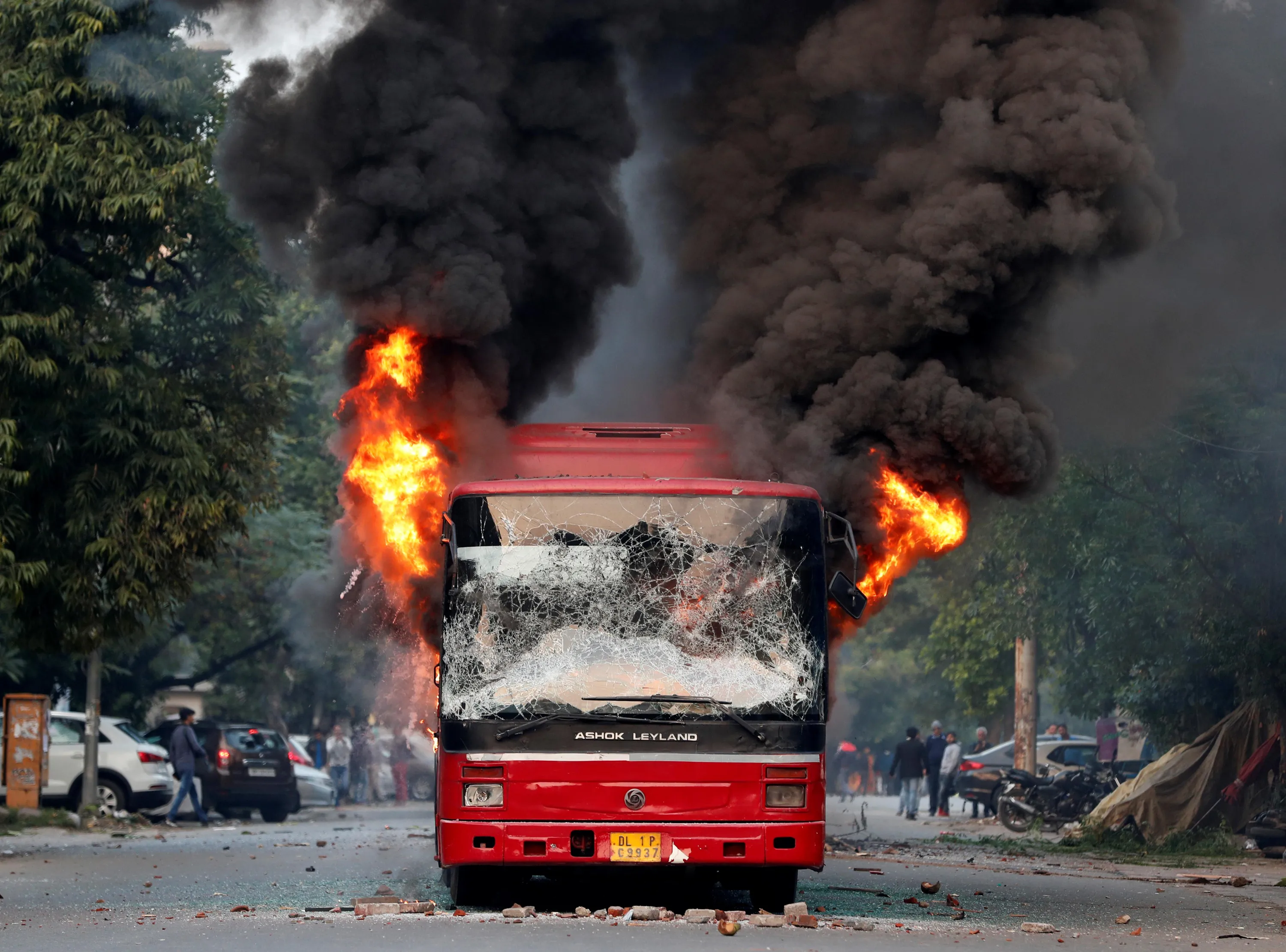 A burning bus is seen after it was set on fire by demonstrators during a protest against a new citizenship law, in New Delhi, India, December 15, 2019. Angry protesters in northeast India vowed on December 15 to keep demonstrating against a contentious citizenship law as the death toll from bloody clashes opposing the bill rose to six. (Photo by Adnan Abidi/Reuters)