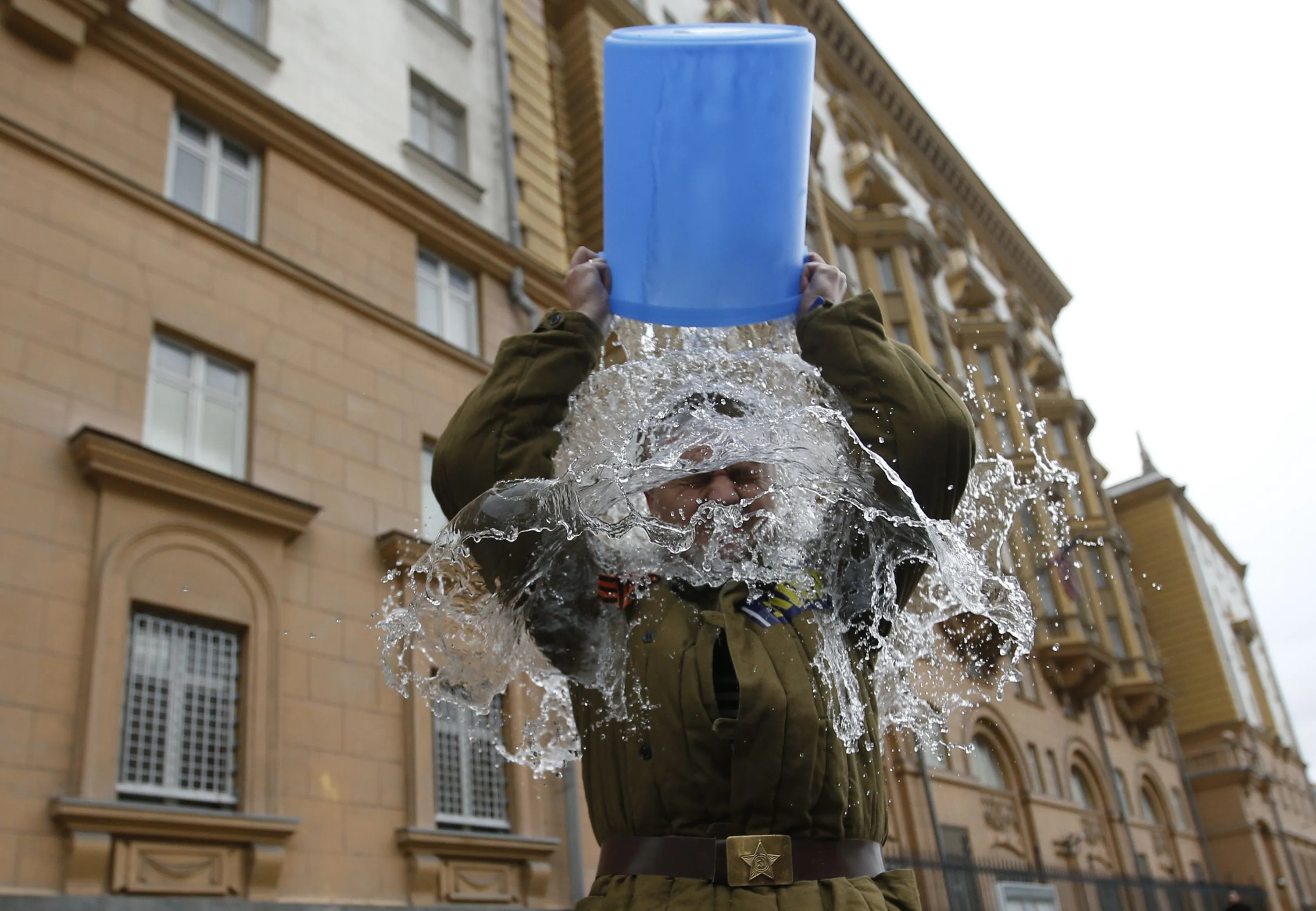 Alexei Didenko, a deputy for the Russian State Duma, dumps a bucket of cold water on himself in front of the American embassy in Moscow, September 3, 2014. Didenko said he was performing the ice bucket challenge not only to raise awareness for ALS (Amyotrophic Lateral Sclerosis) research, but also to protest against new U.S. Ambassador to Russia John Tefft, and what Didenko calls “anti-Russian American propaganda”. (Photo by Maxim Zmeyev/Reuters)