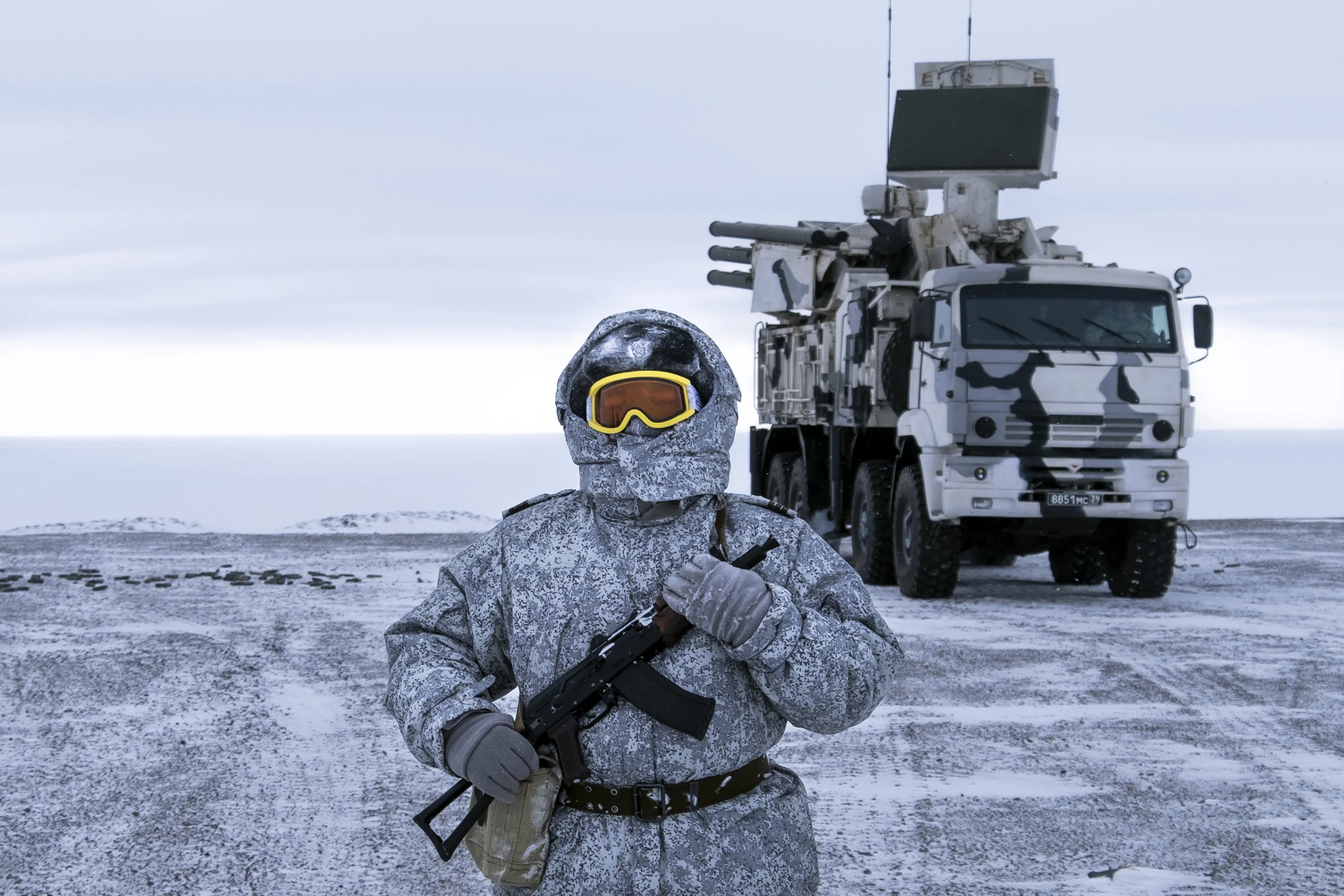 In this photo taken on Wednesday, April 3, 2019, a Russian solder stands guard as Pansyr-S1 air defense system on the Kotelny Island, part of the New Siberian Islands archipelago located between the Laptev Sea and the East Siberian Sea, Russia. Russia has made reaffirming its military presence in the Arctic the top priority amid an intensifying international rivalry over the region that is believed to hold up to one-quarter of the planet's undiscovered oil and gas. (Photo by Vladimir Isachenkov/AP Photo)