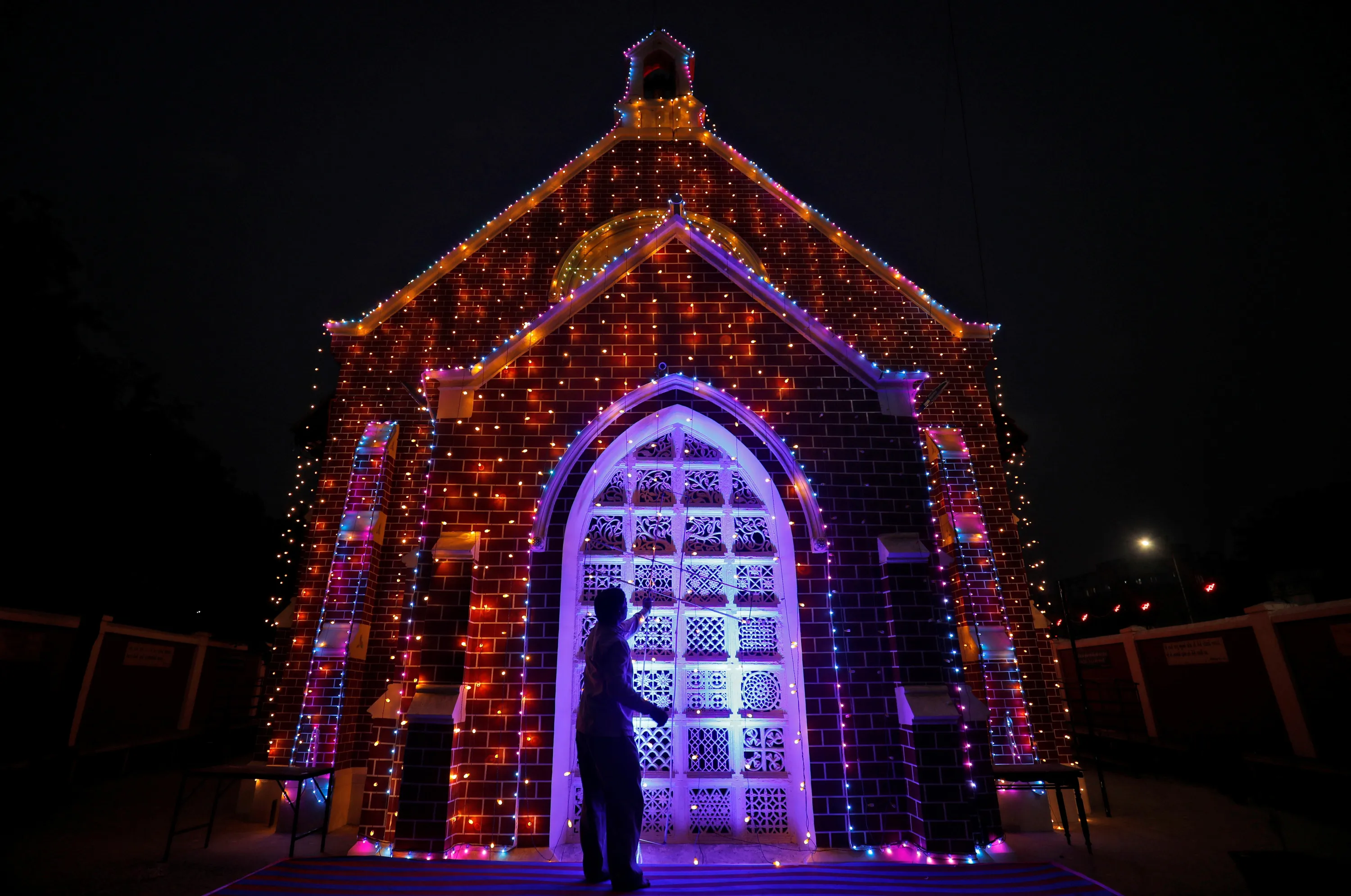 A man installs decorative lights on a church ahead of Christmas celebrations in Ahmedabad, India, December 23, 2019. (Photo by Amit Dave/Reuters)