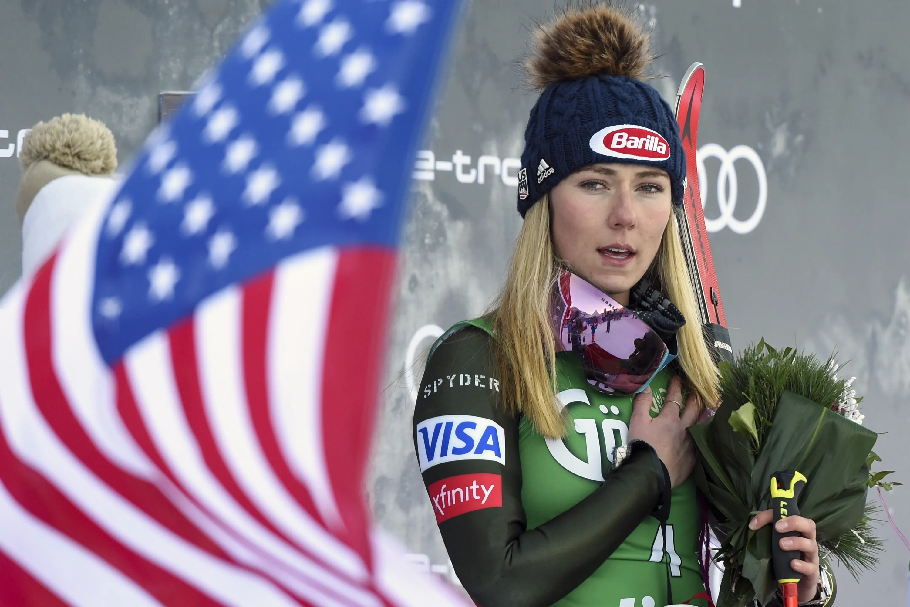 United States' Mikaela Shiffrin, winner of an alpine ski, women's World Cup giant slalom, listens to the national anthem, in Lienz, Austria, Saturday, December 28, 2019. (Photo by Piermarco Tacca/AP Photo)